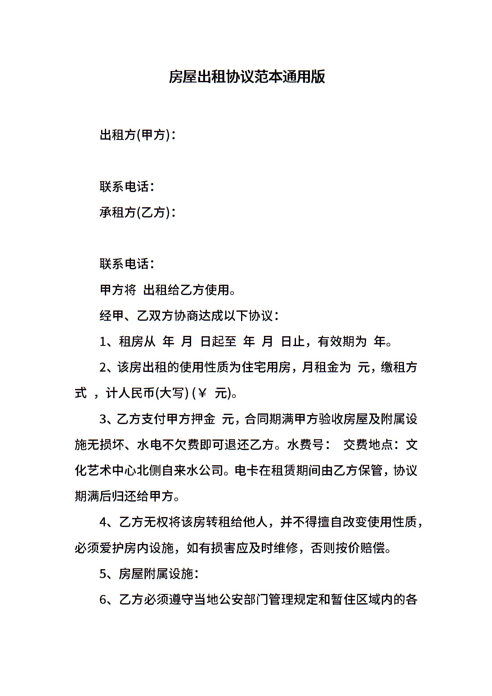 房屋出租协议范本通用版