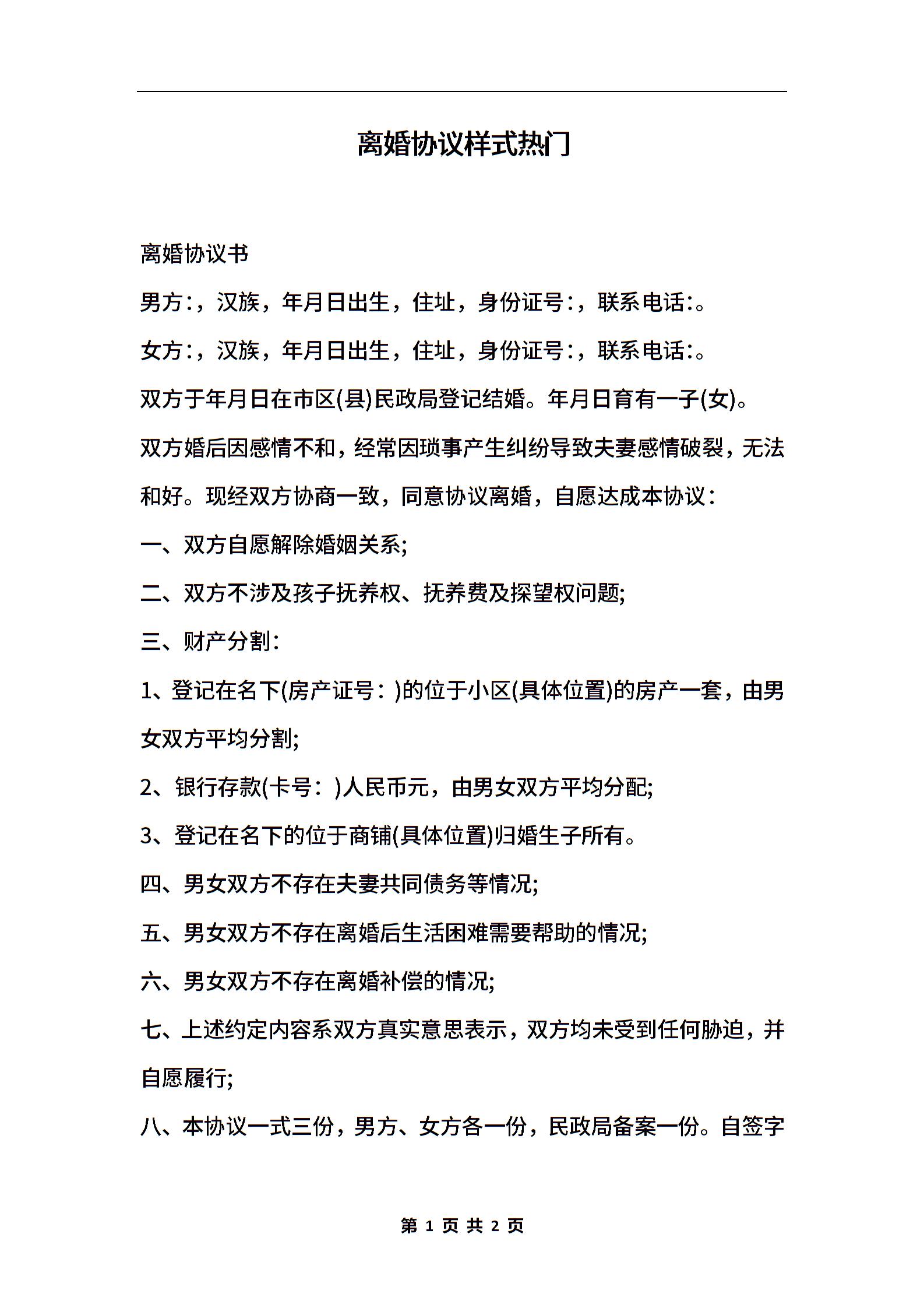 离婚协议样式热门