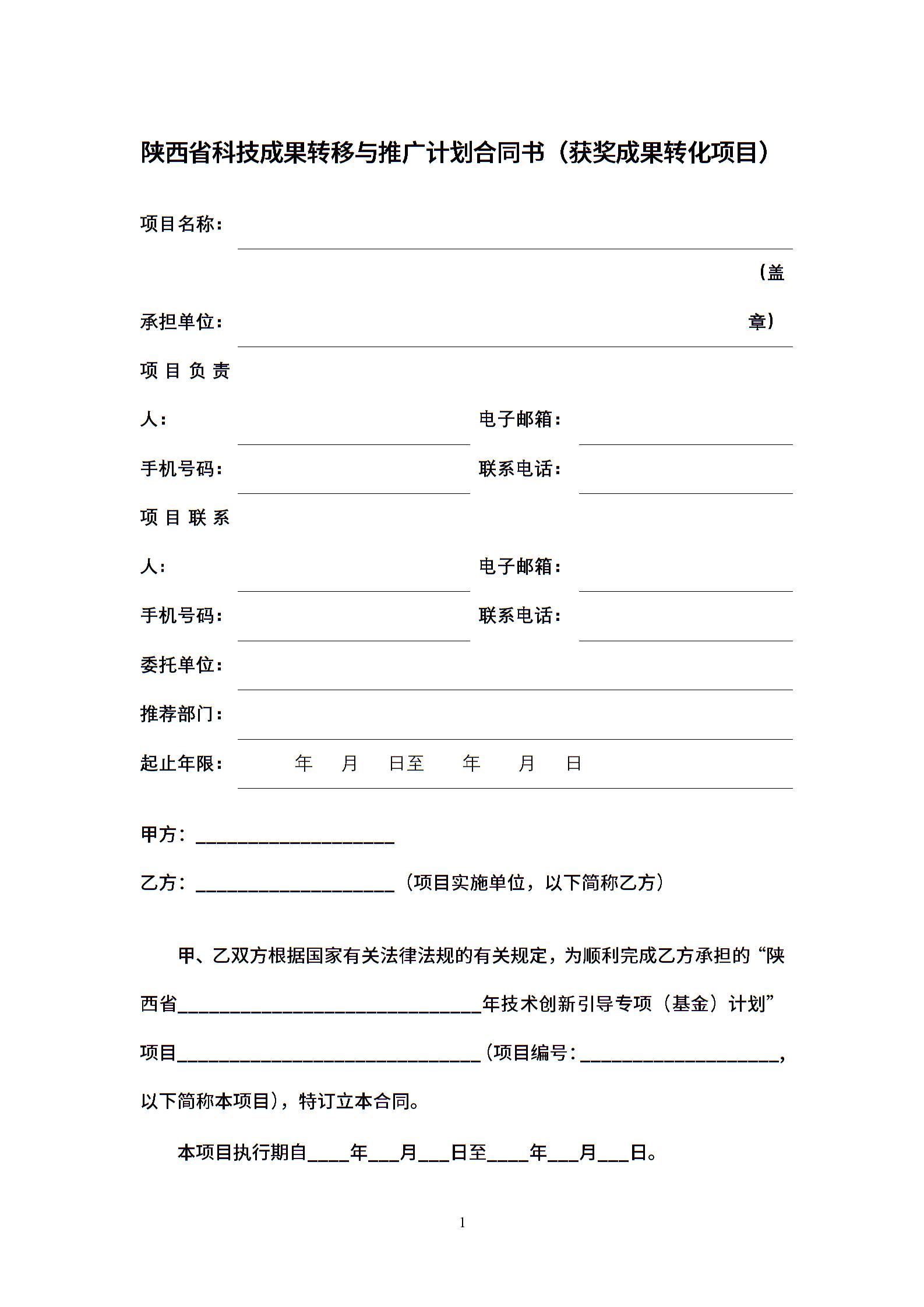 陕西省科技成果转移与推广计划合同书(获奖成果转化项目).docx