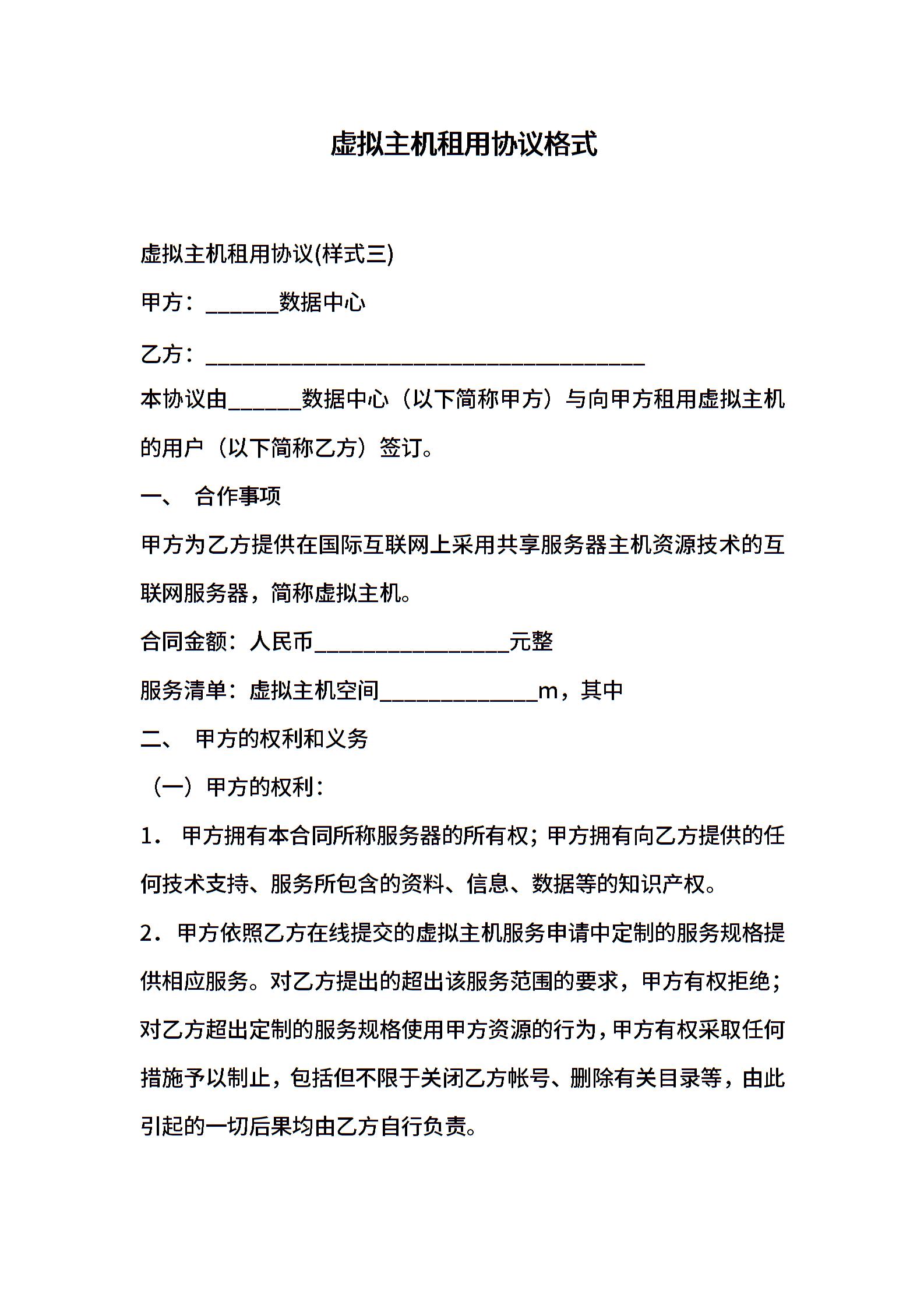 虚拟主机租用协议格式