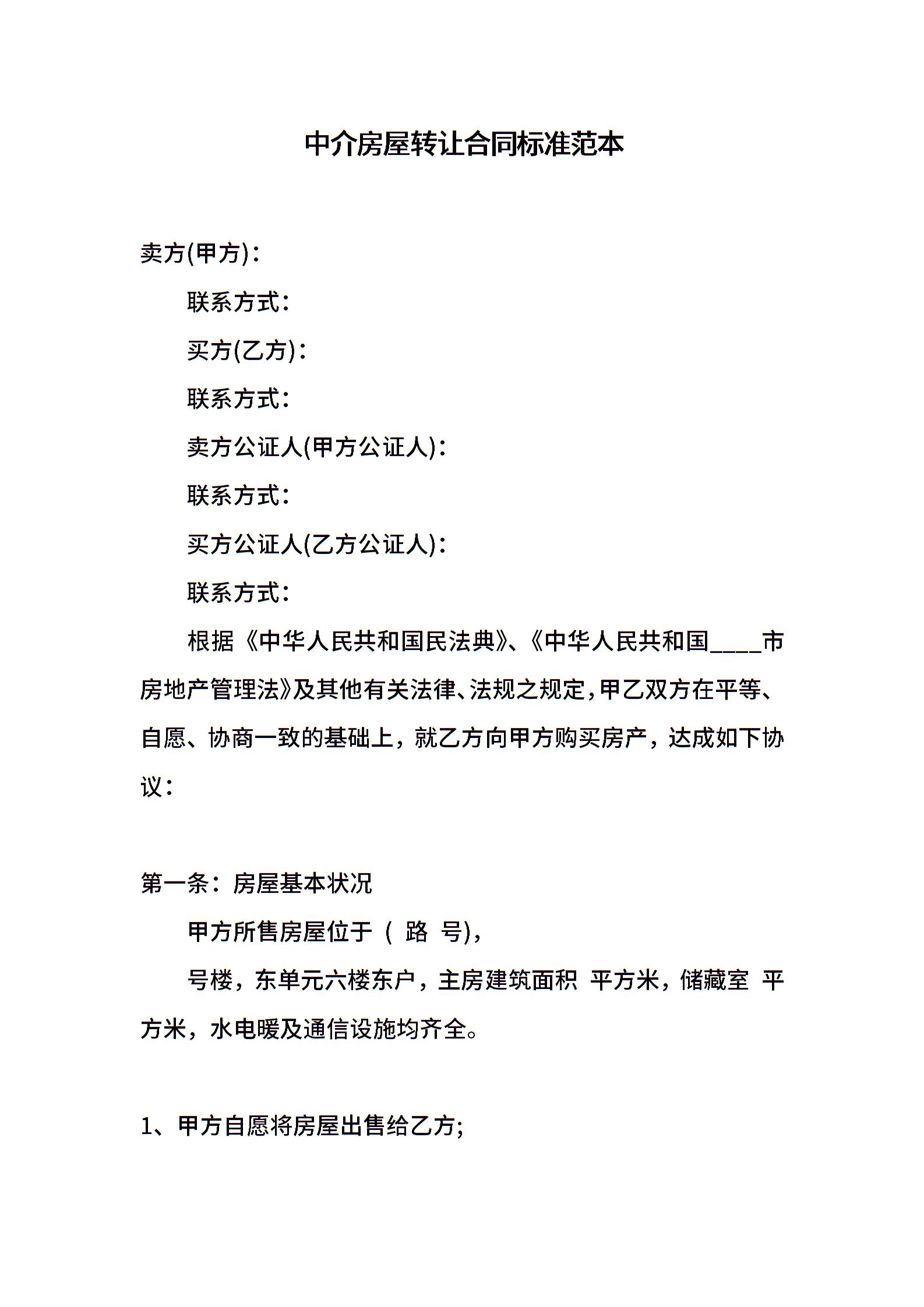 中介房屋转让合同标准范本
