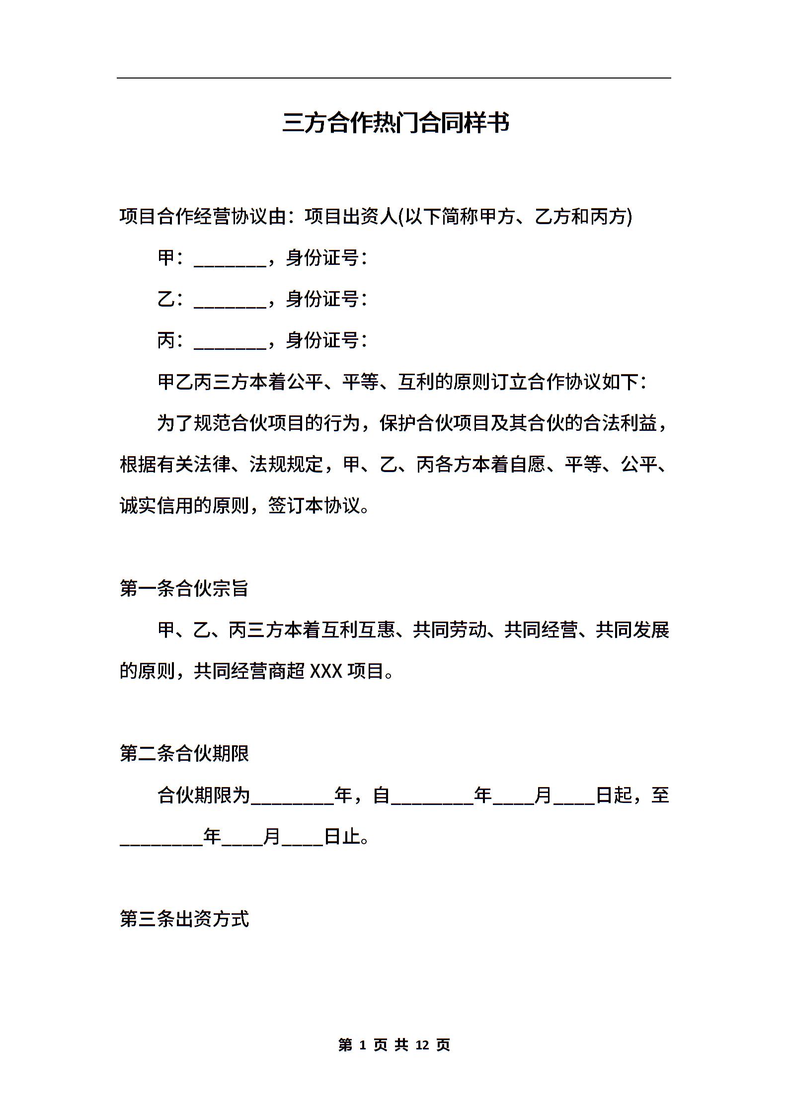 三方合作热门合同样书