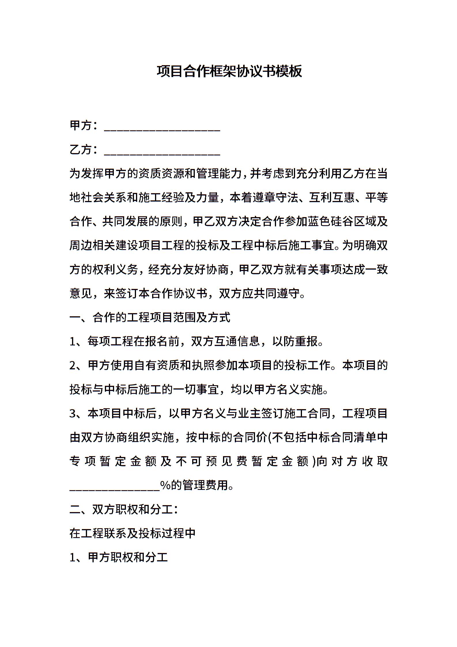 项目合作框架协议书模板