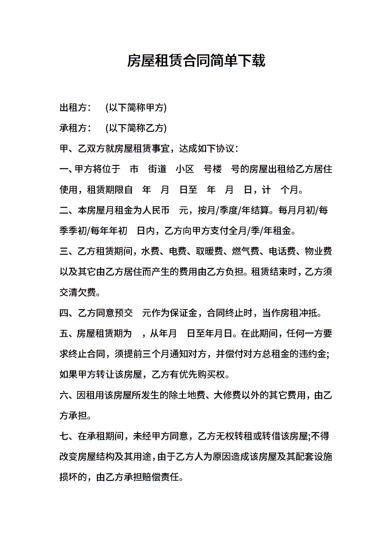 房屋租赁合同简单下载