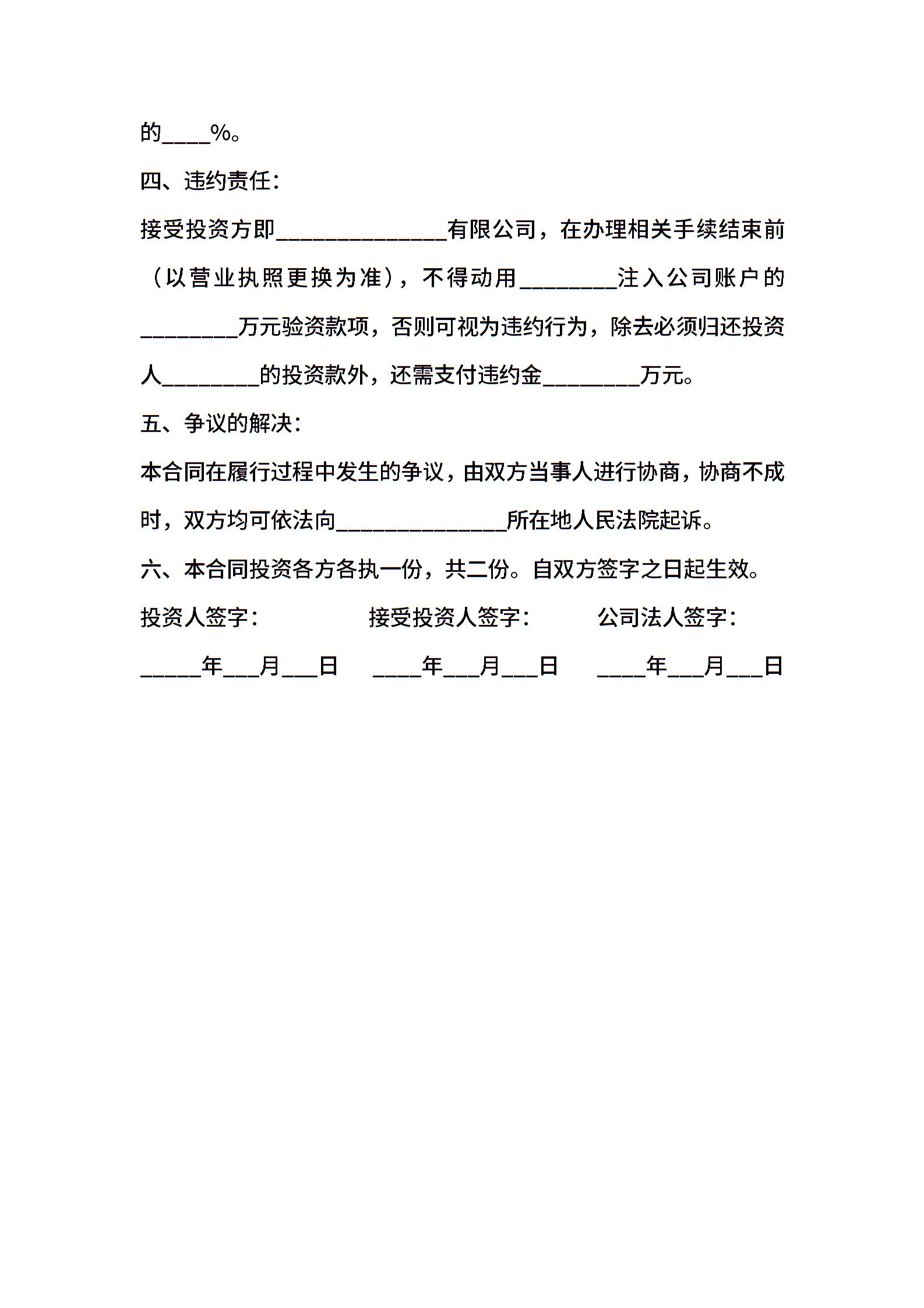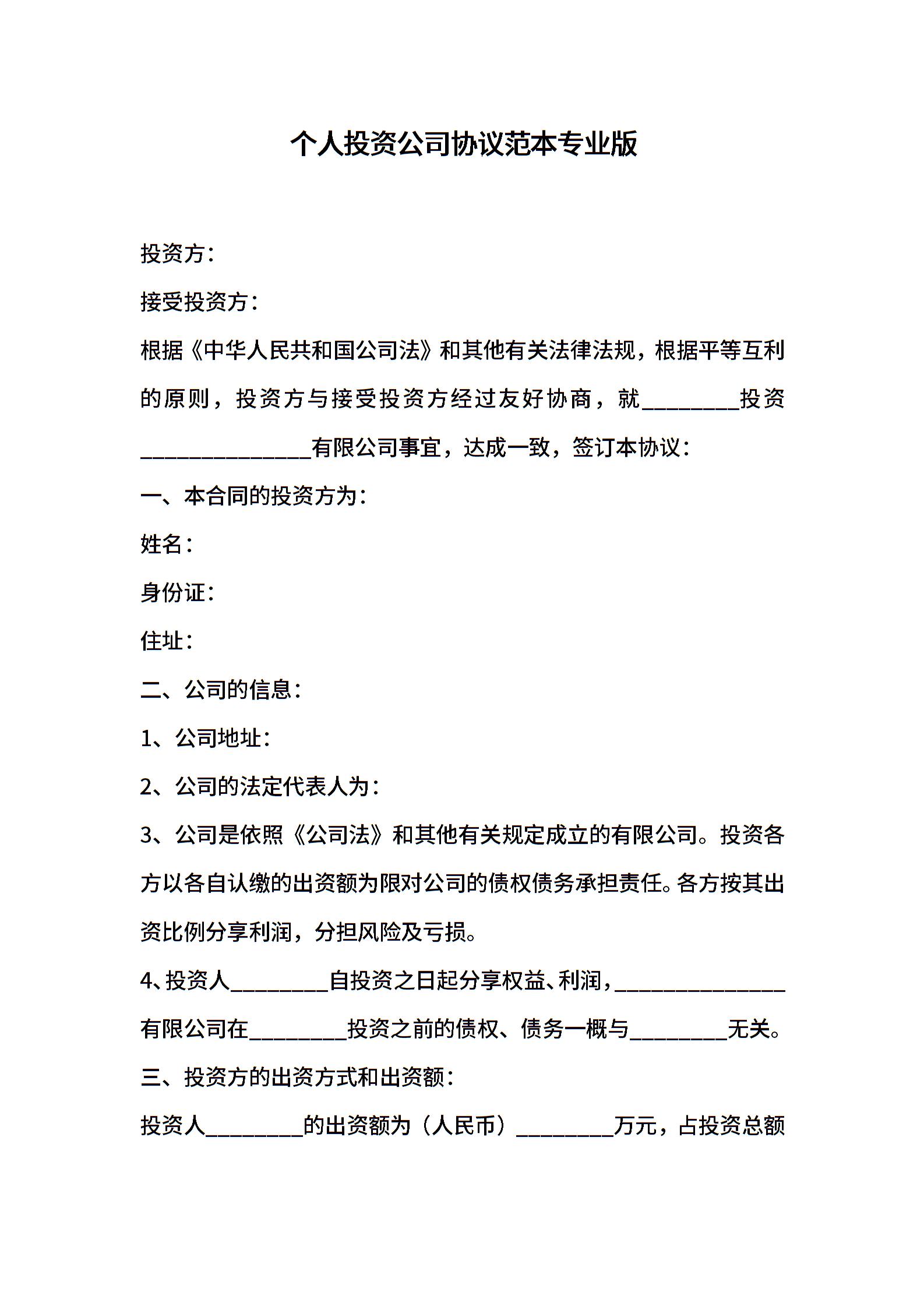 个人投资公司协议范本专业版