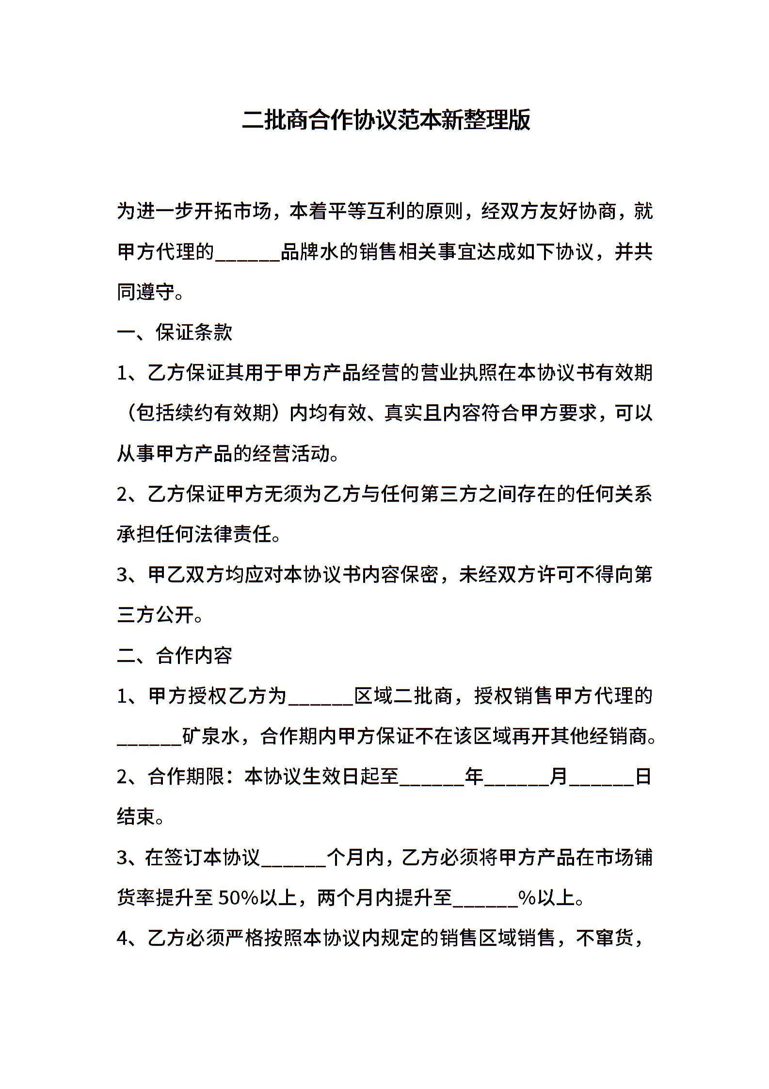 二批商合作协议范本新整理版