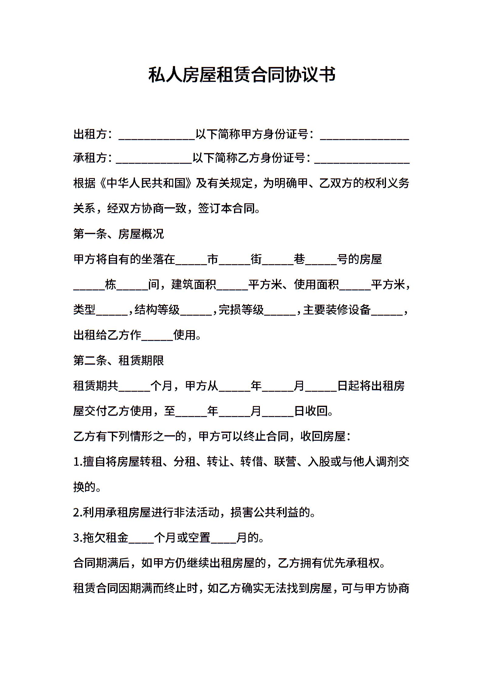 私人房屋租赁合同协议书