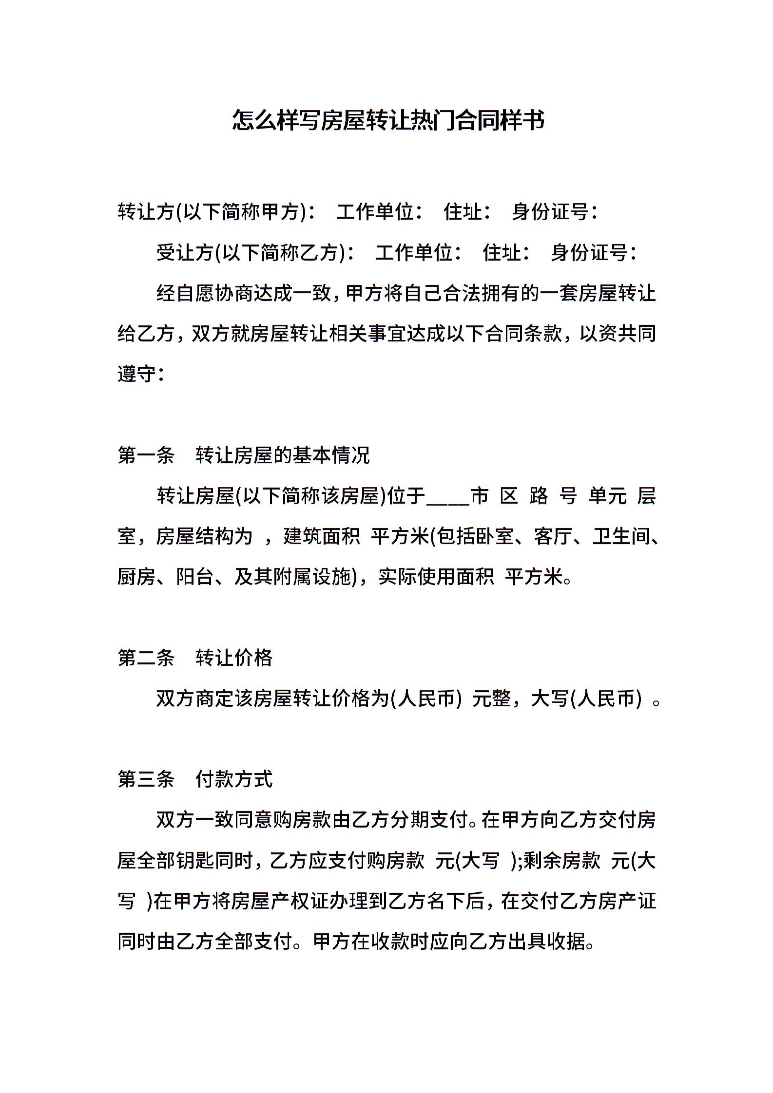 怎么样写房屋转让热门合同样书