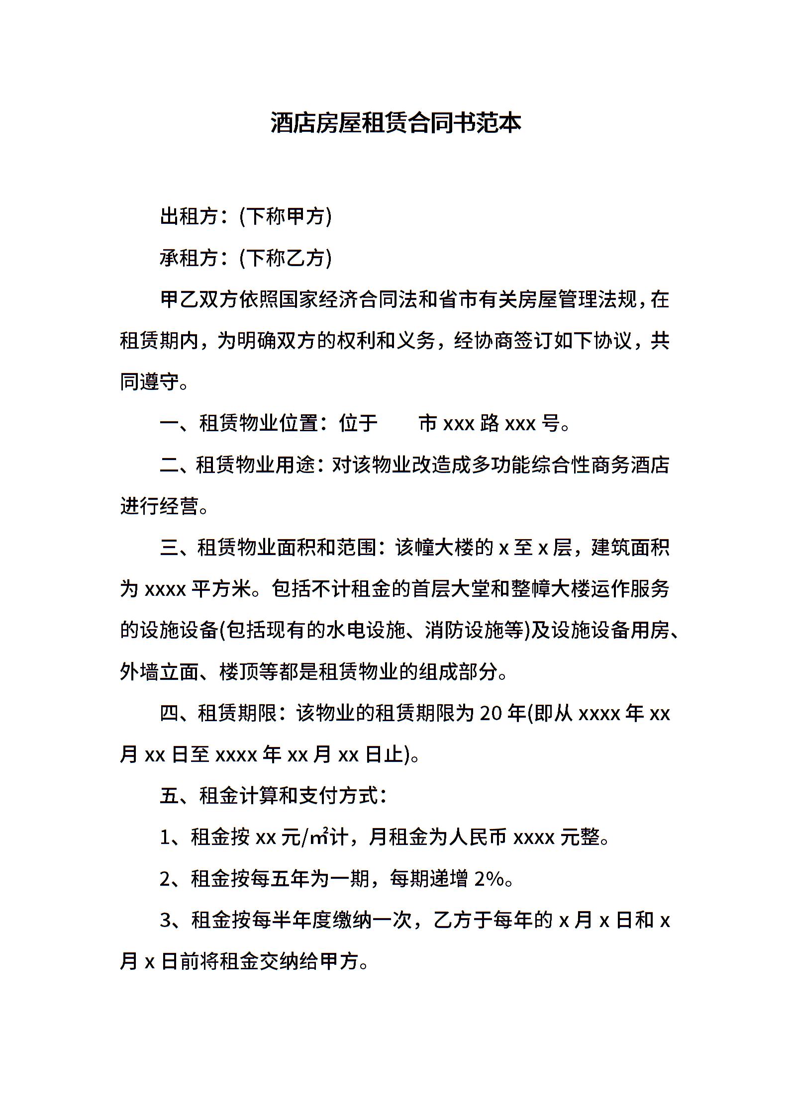酒店房屋租赁合同书范本