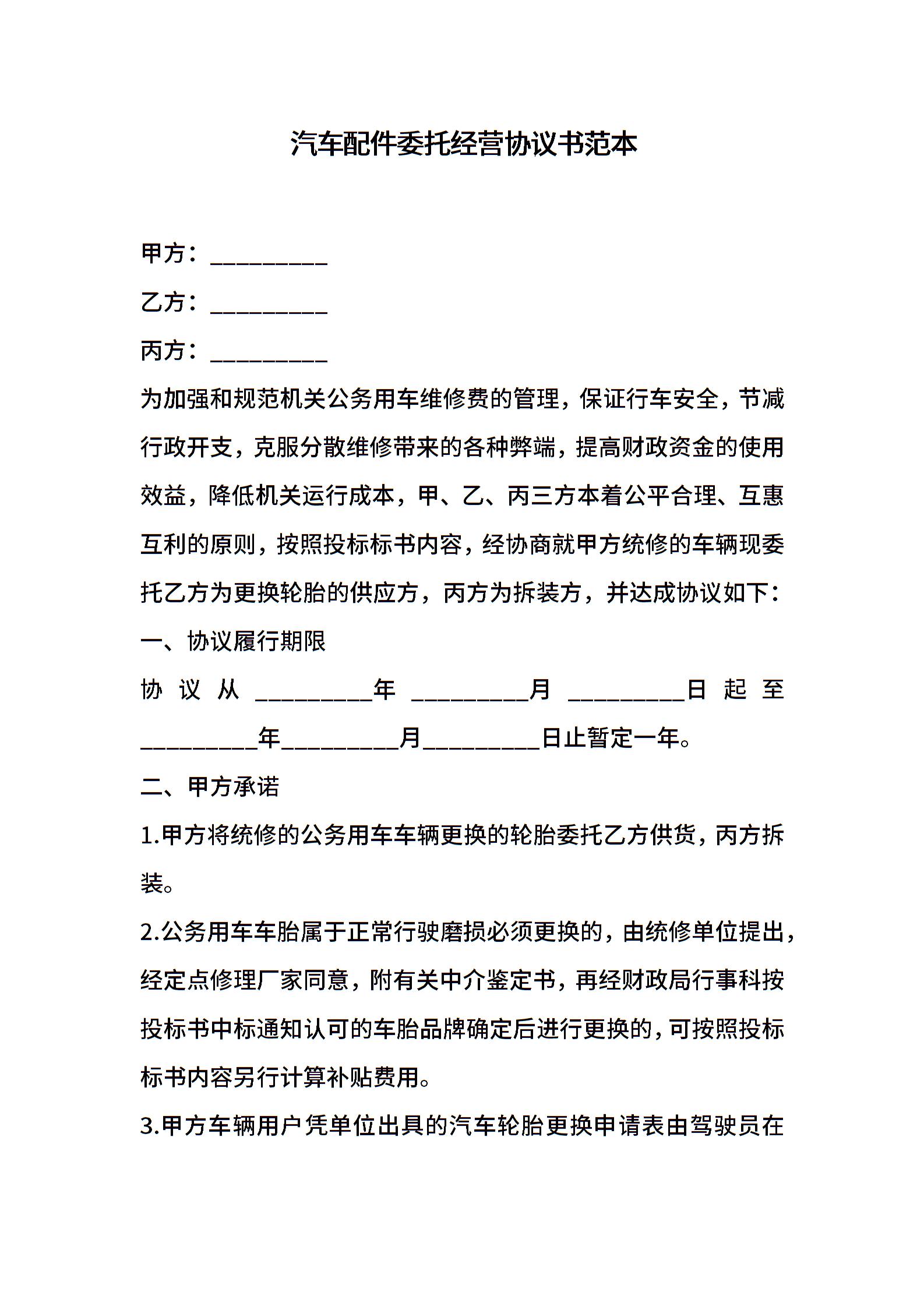 汽车配件委托经营协议书范本