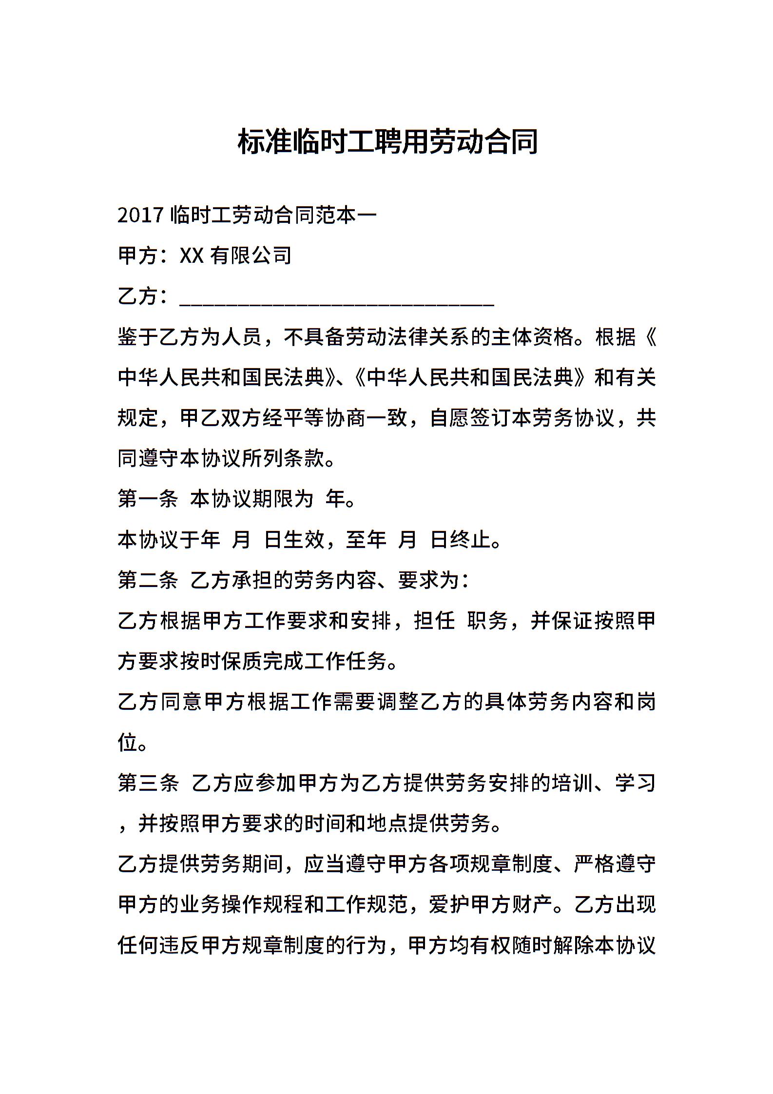 标准临时工聘用劳动合同