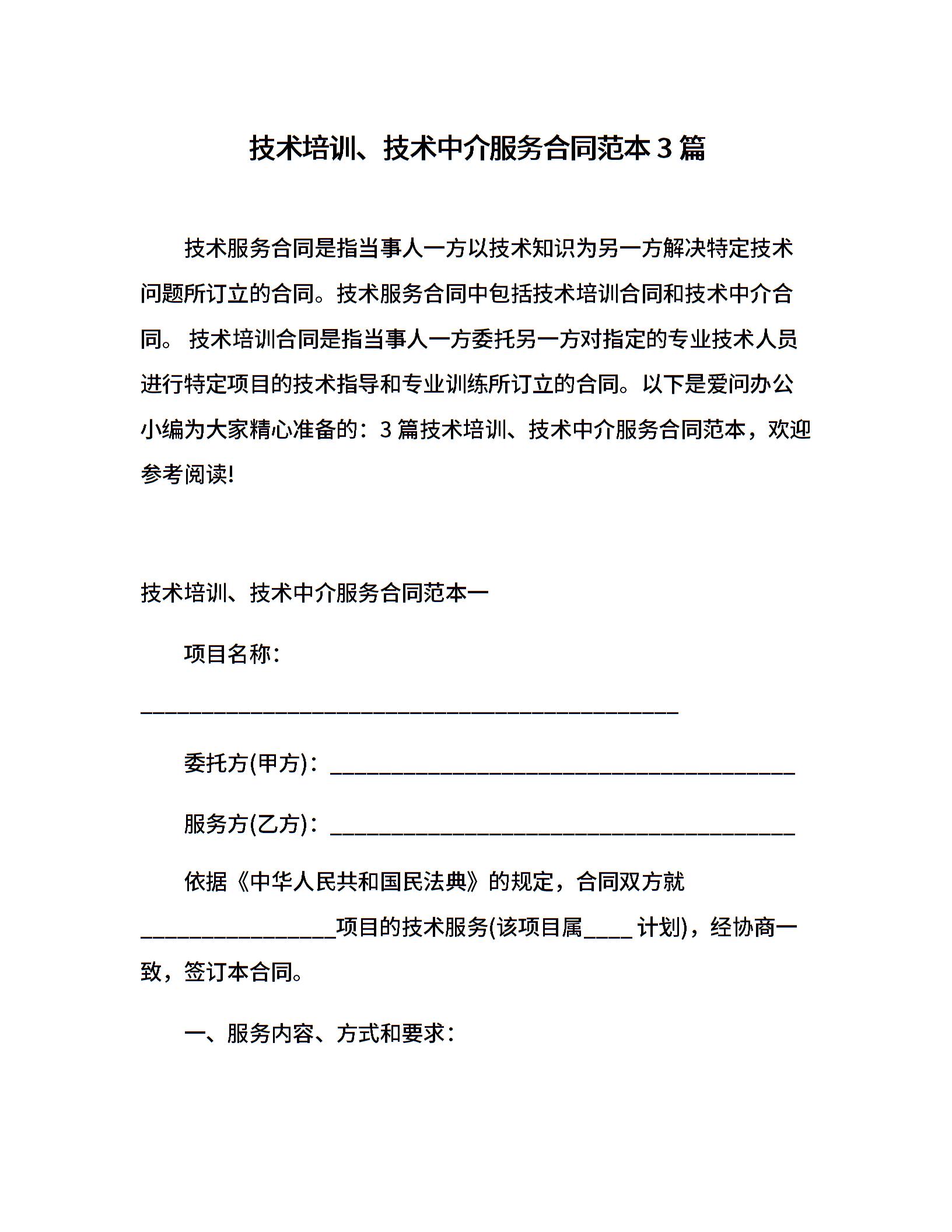 技术培训、技术中介服务合同范本3篇