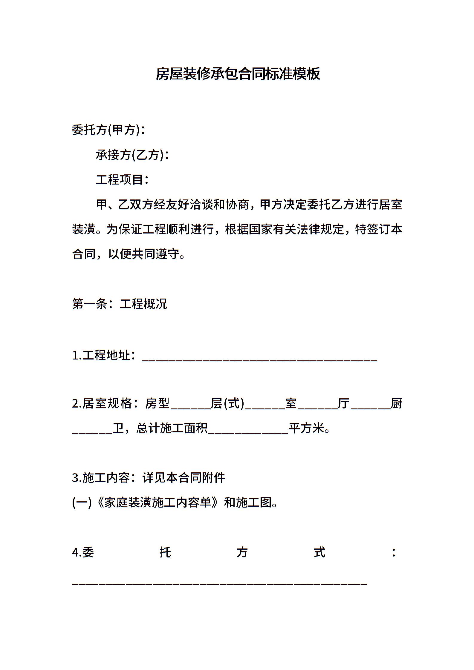 房屋装修承包合同标准模板