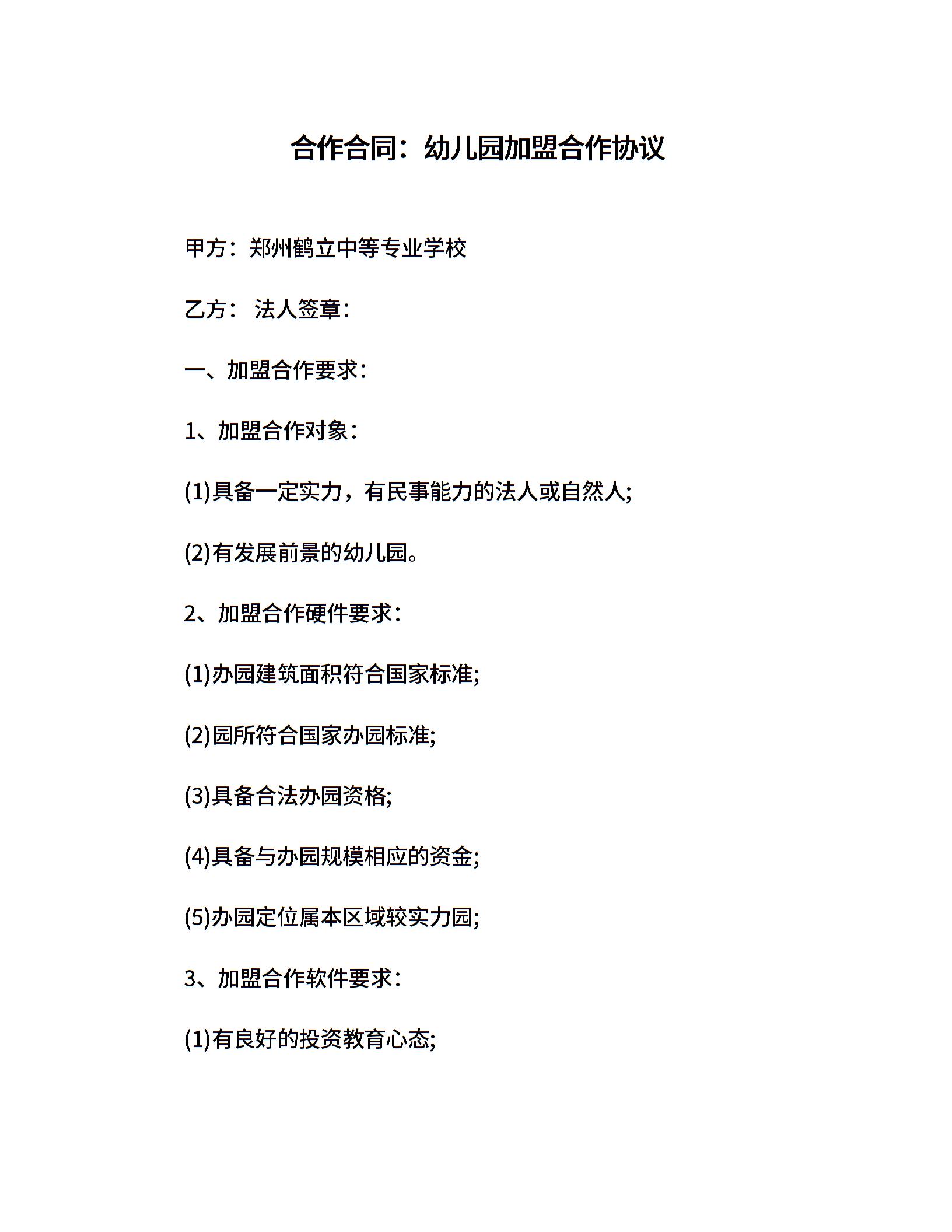 合作合同:幼儿园加盟合作协议