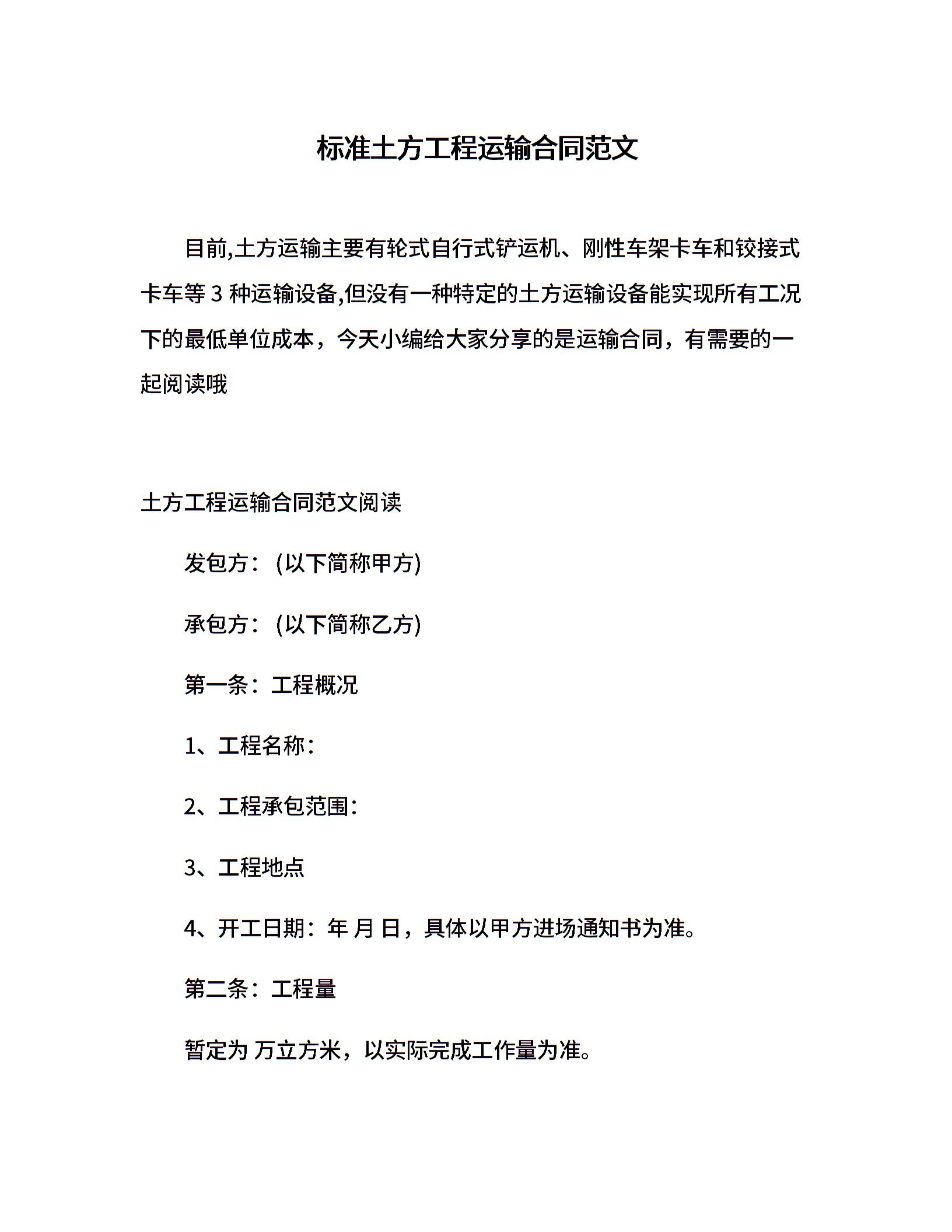标准土方工程运输合同范文