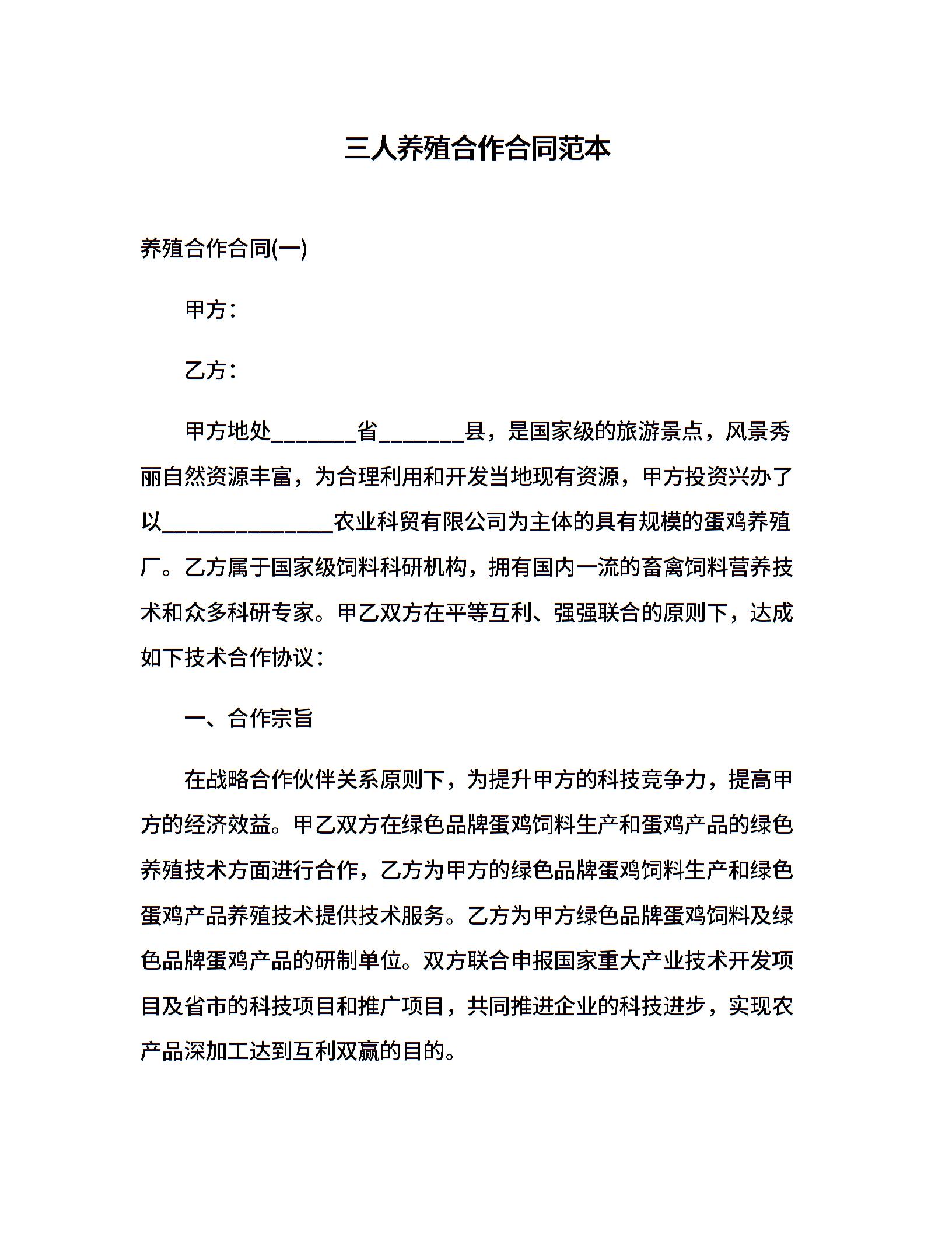 三人养殖合作合同范本