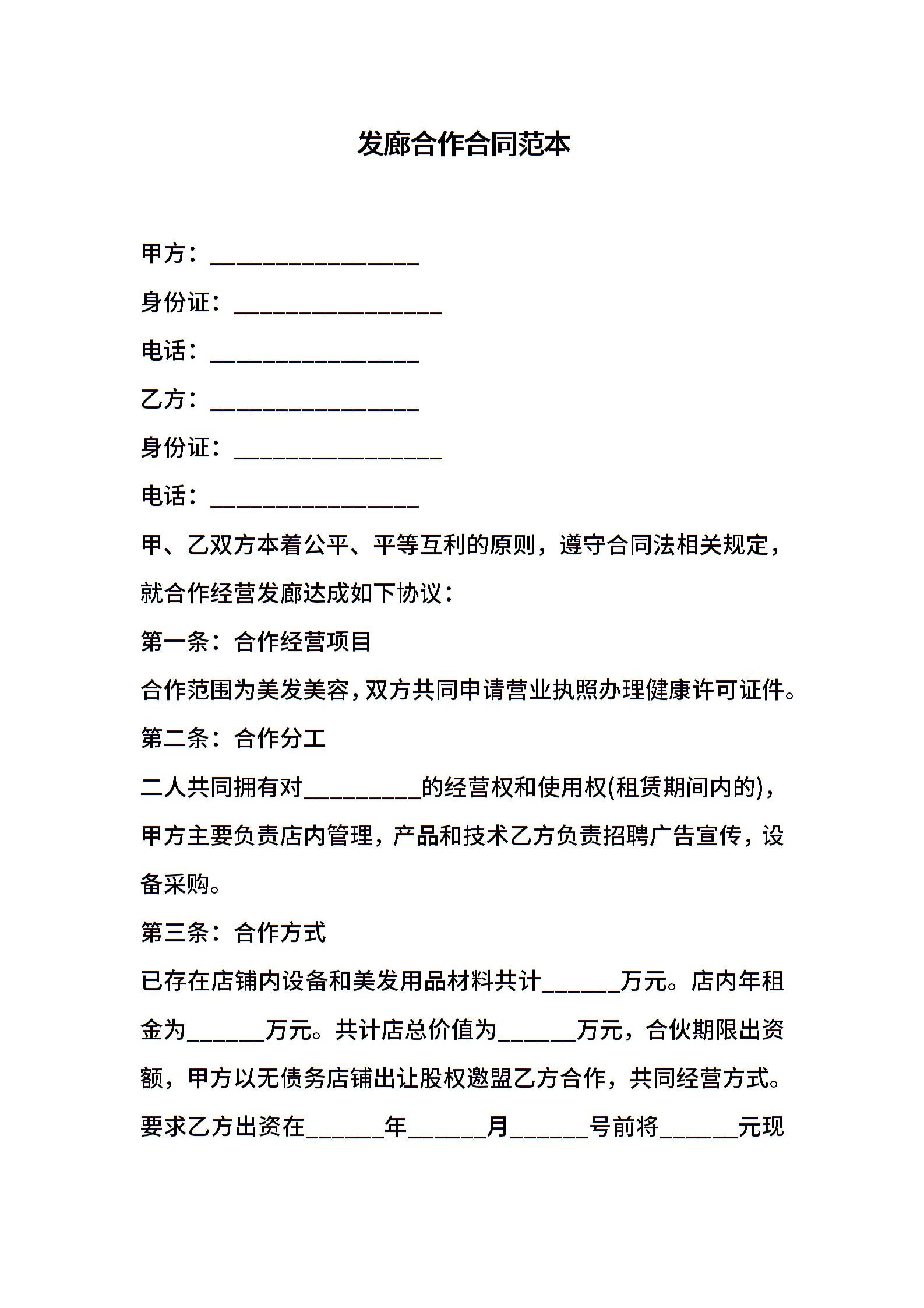 发廊合作合同范本
