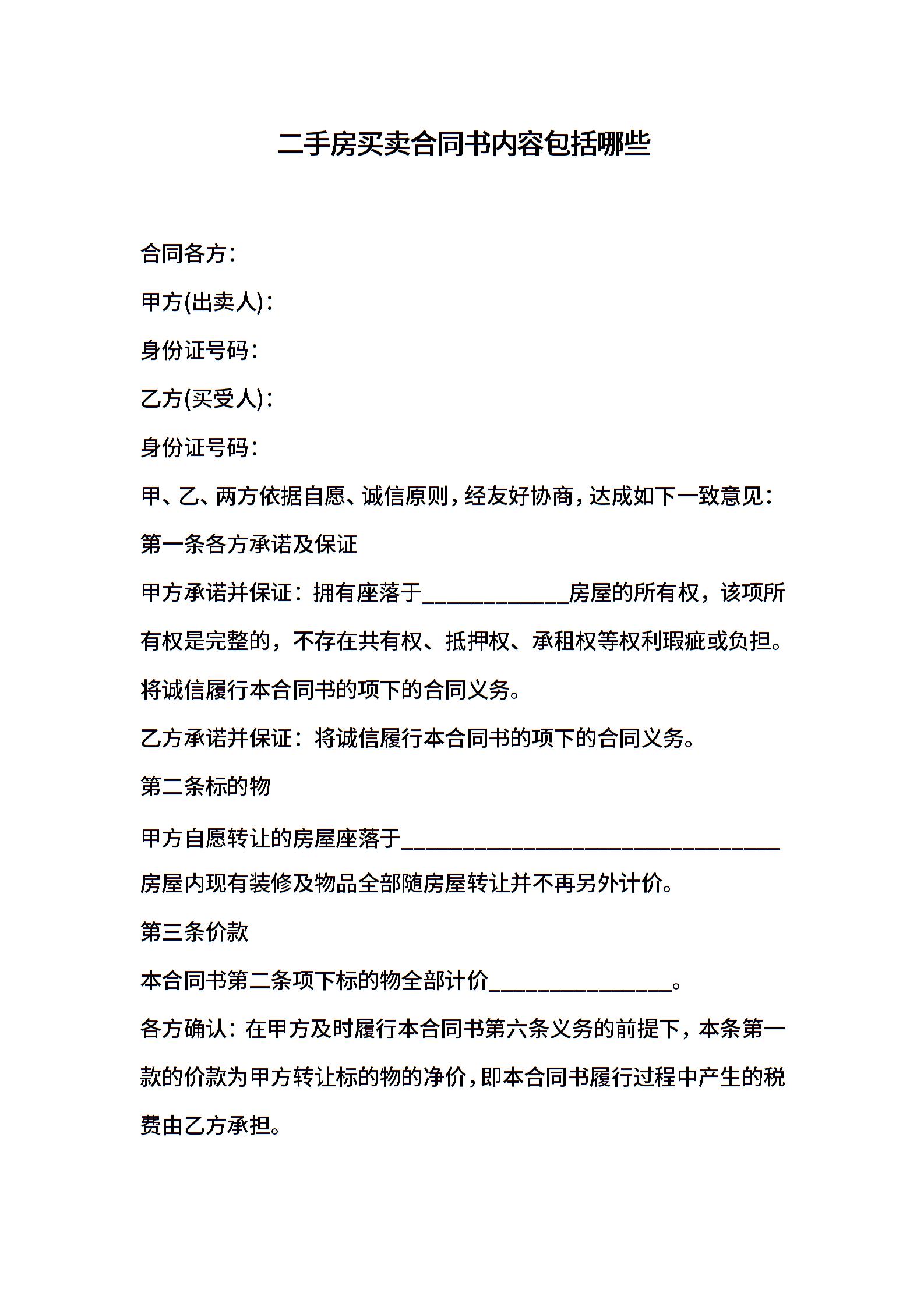二手房买卖合同书内容包括哪些