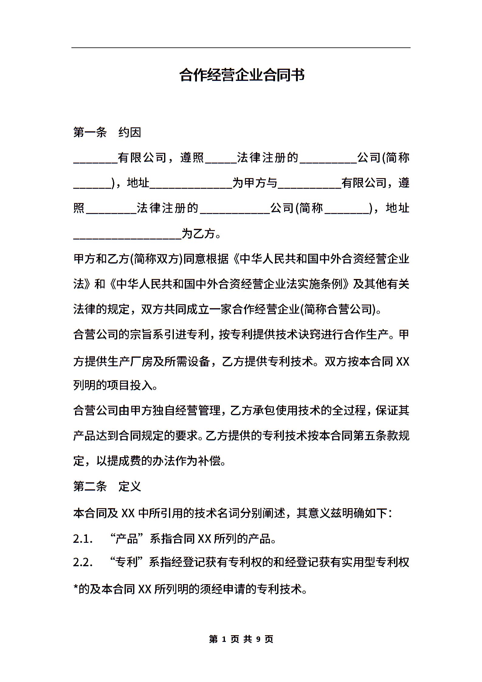 合作经营企业合同书