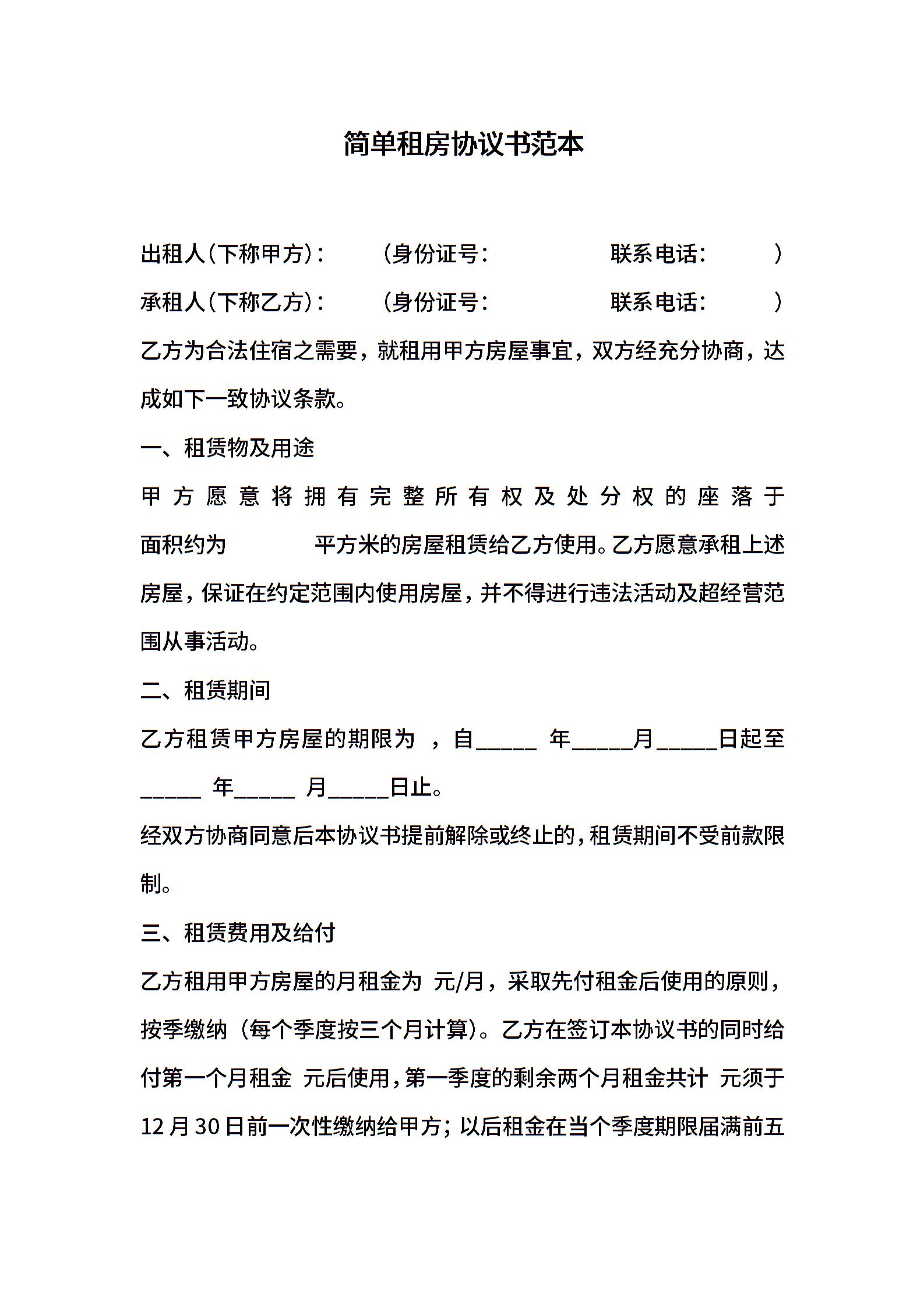 简单租房协议书范本