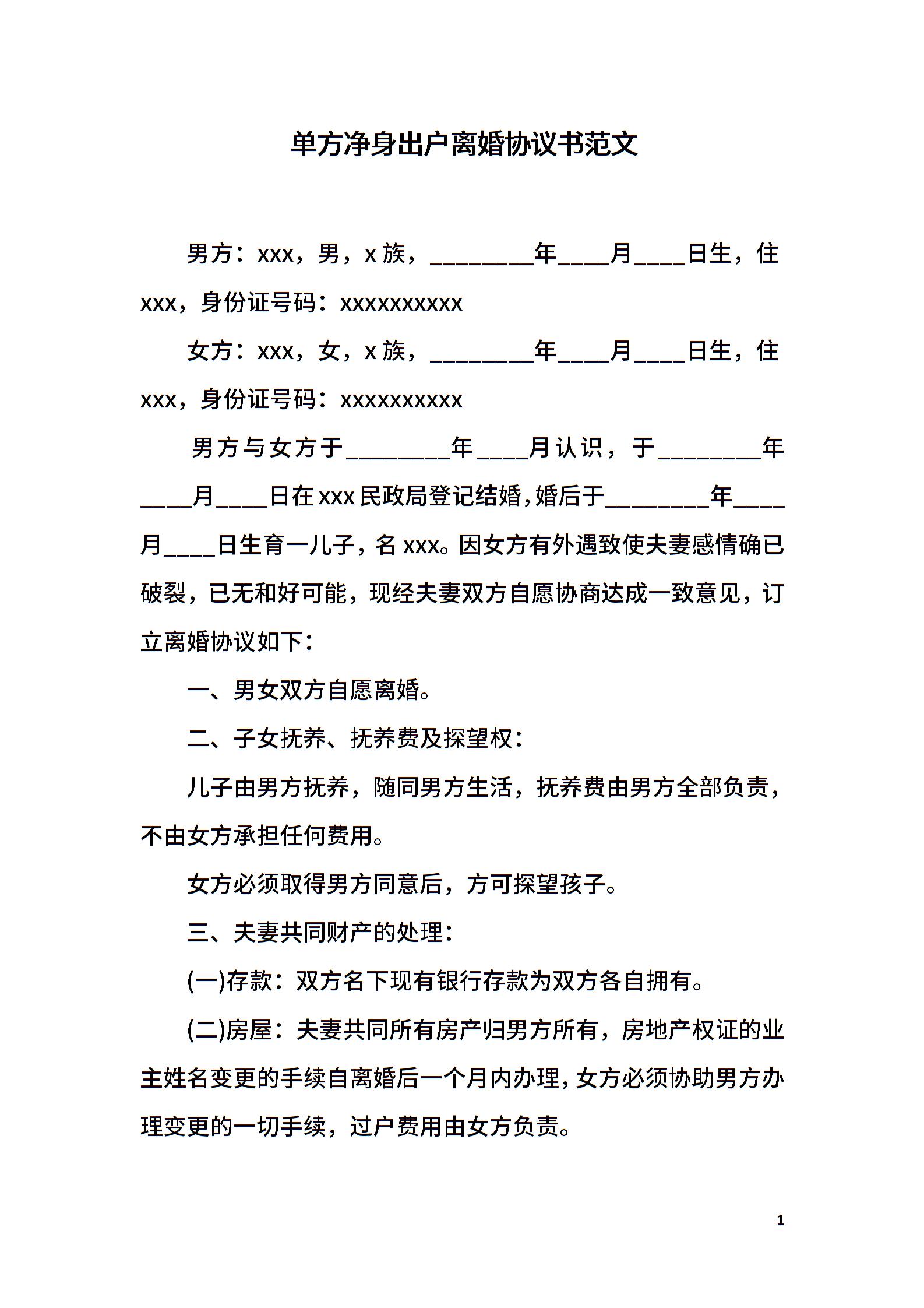 单方净身出户离婚协议书范文