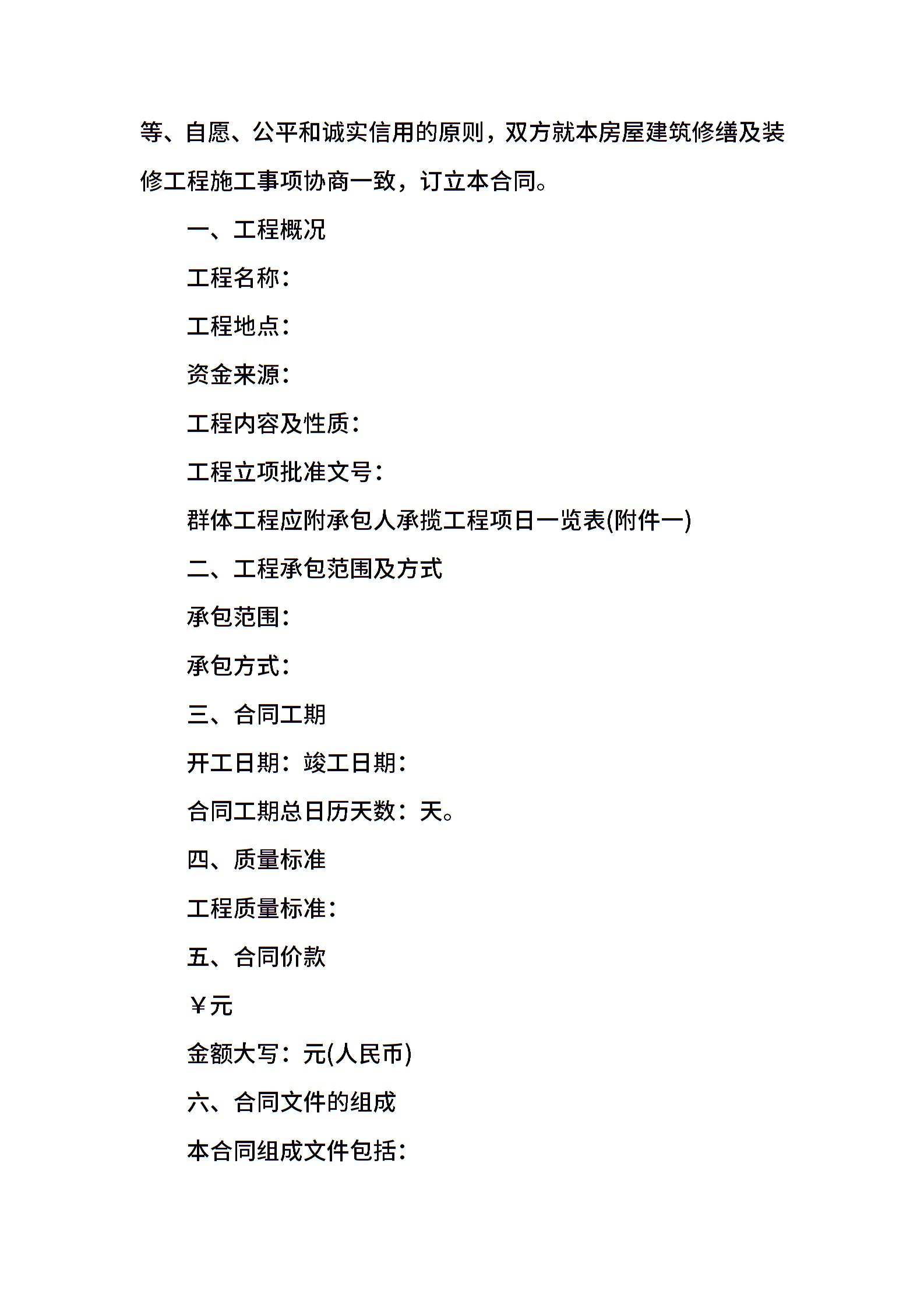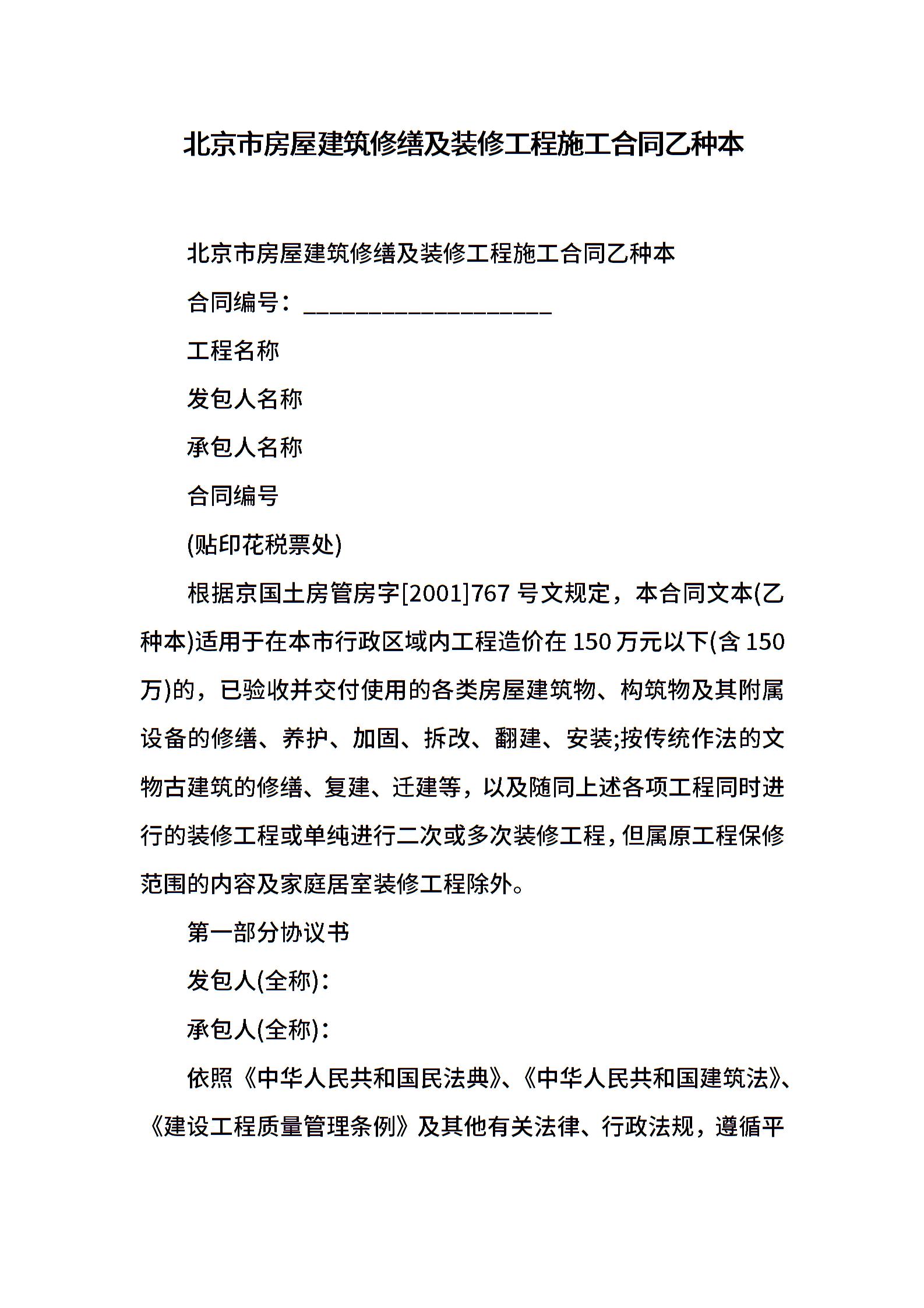 北京市房屋建筑修缮及装修工程施工合同乙种本