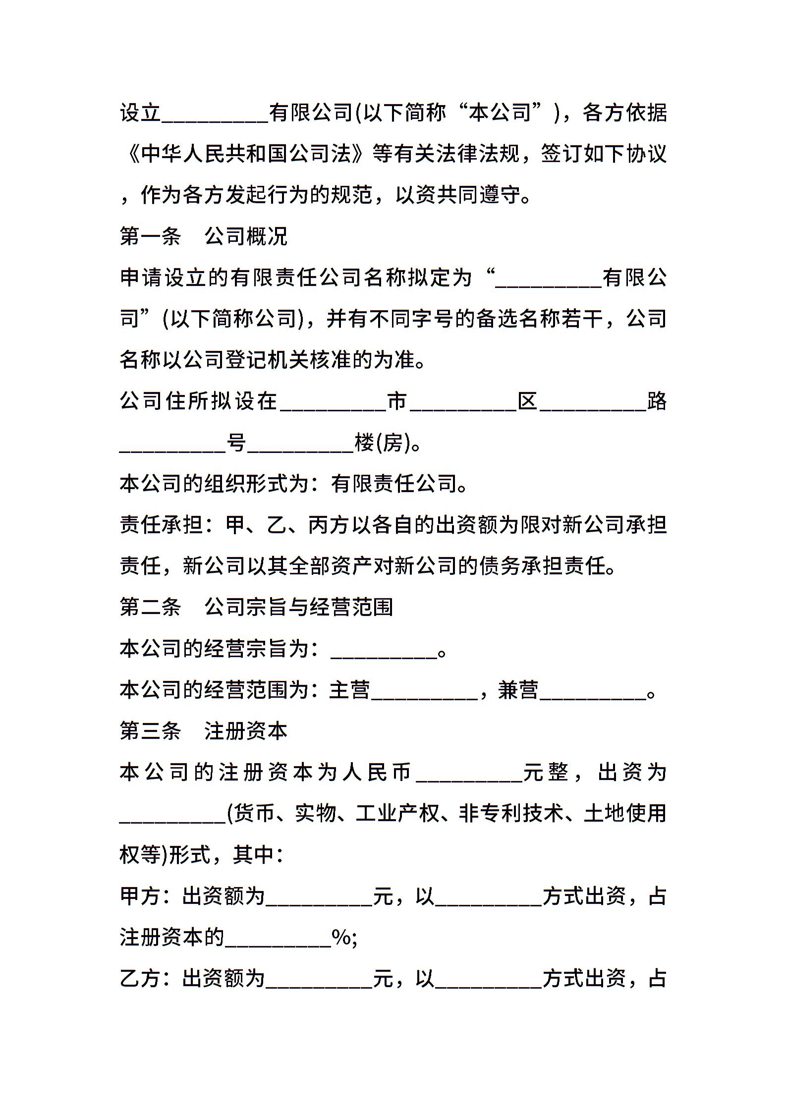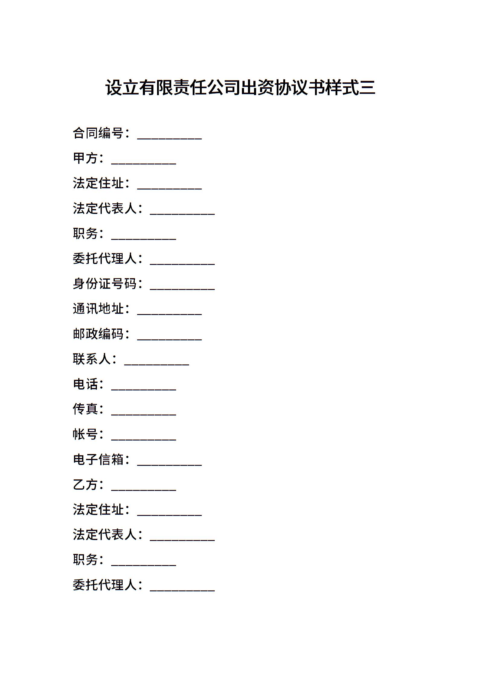 设立有限责任公司出资协议书样式三