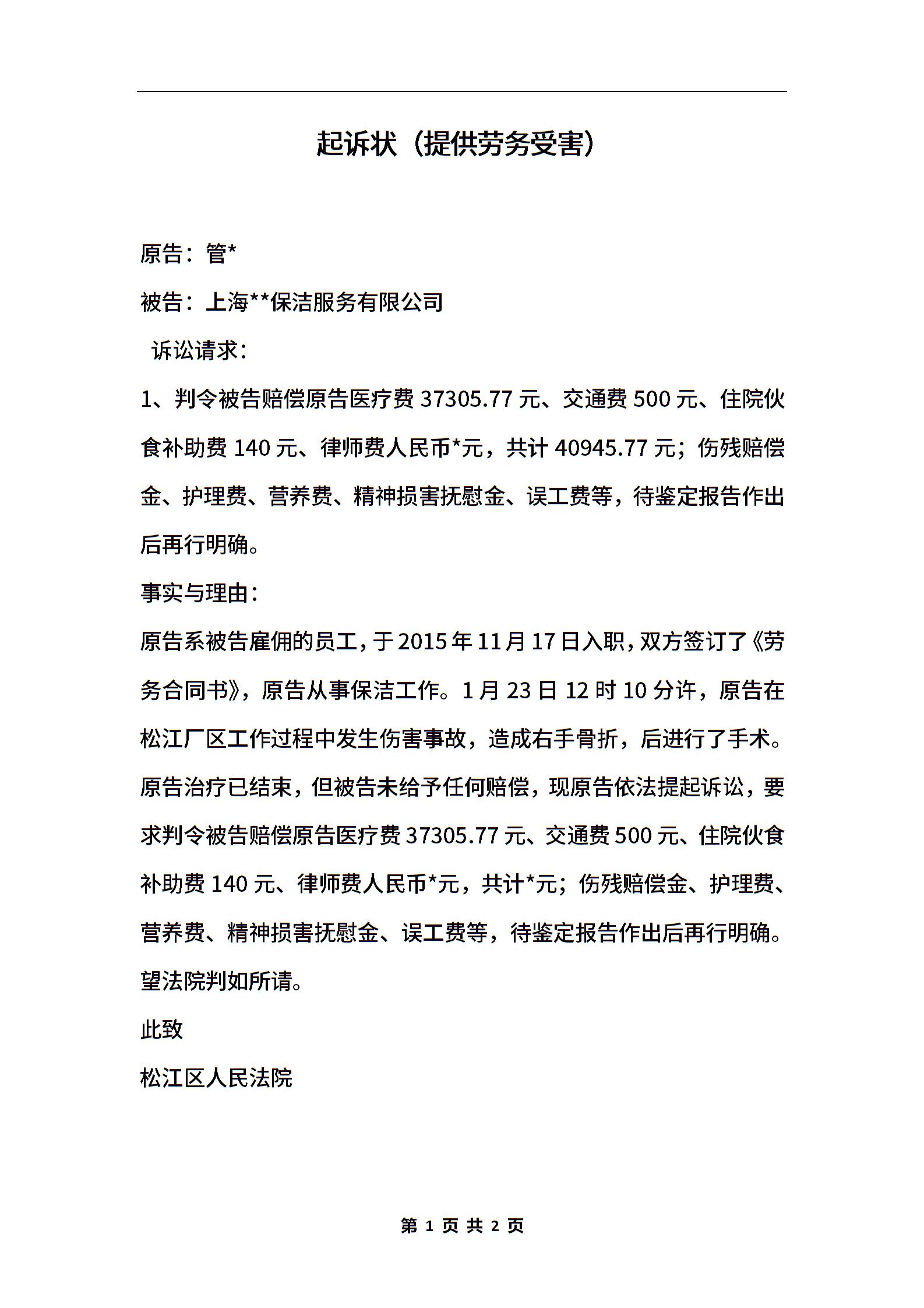 起诉状(提供劳务受害)
