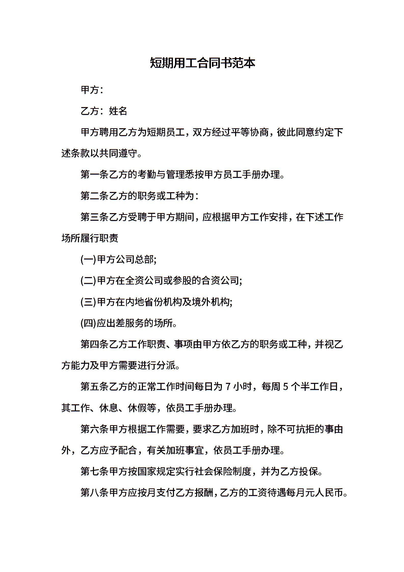 短期用工合同书范本