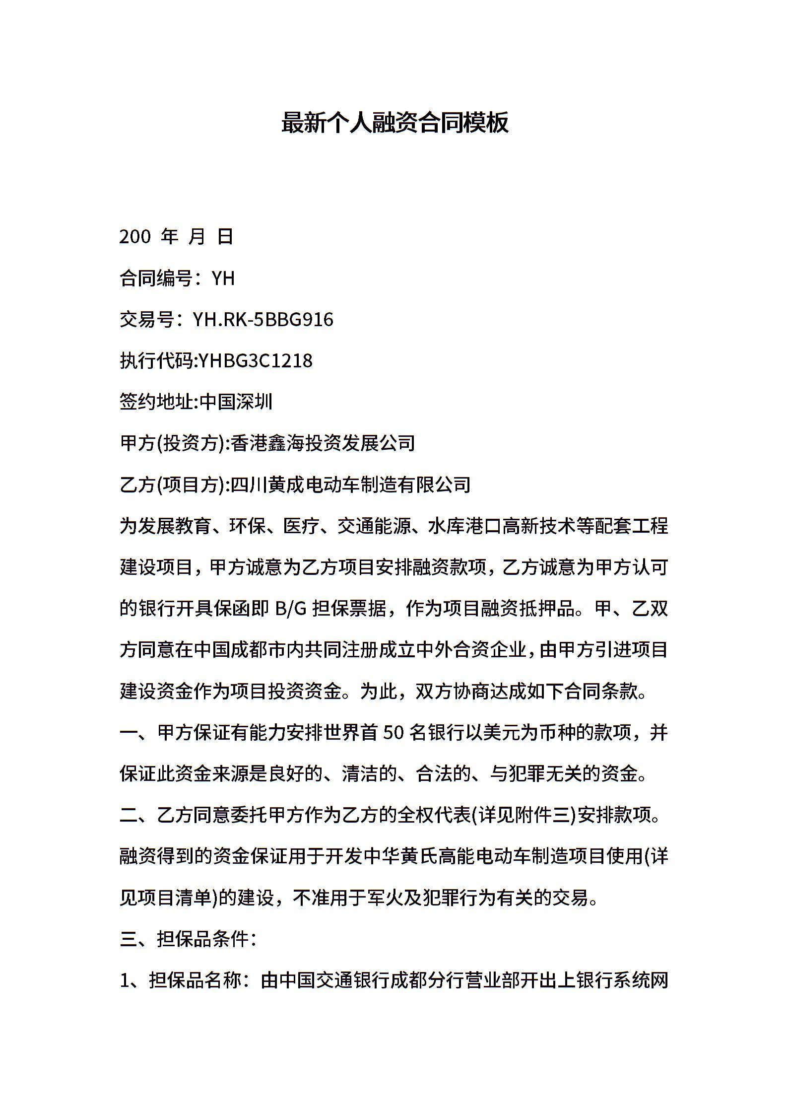 最新个人融资合同模板