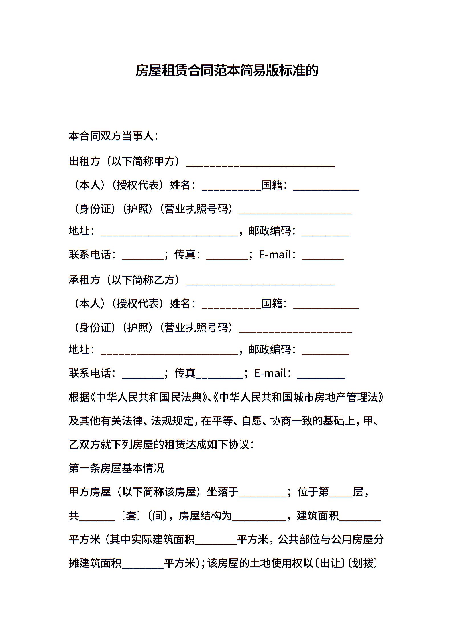 房屋租赁合同范本简易版标准的