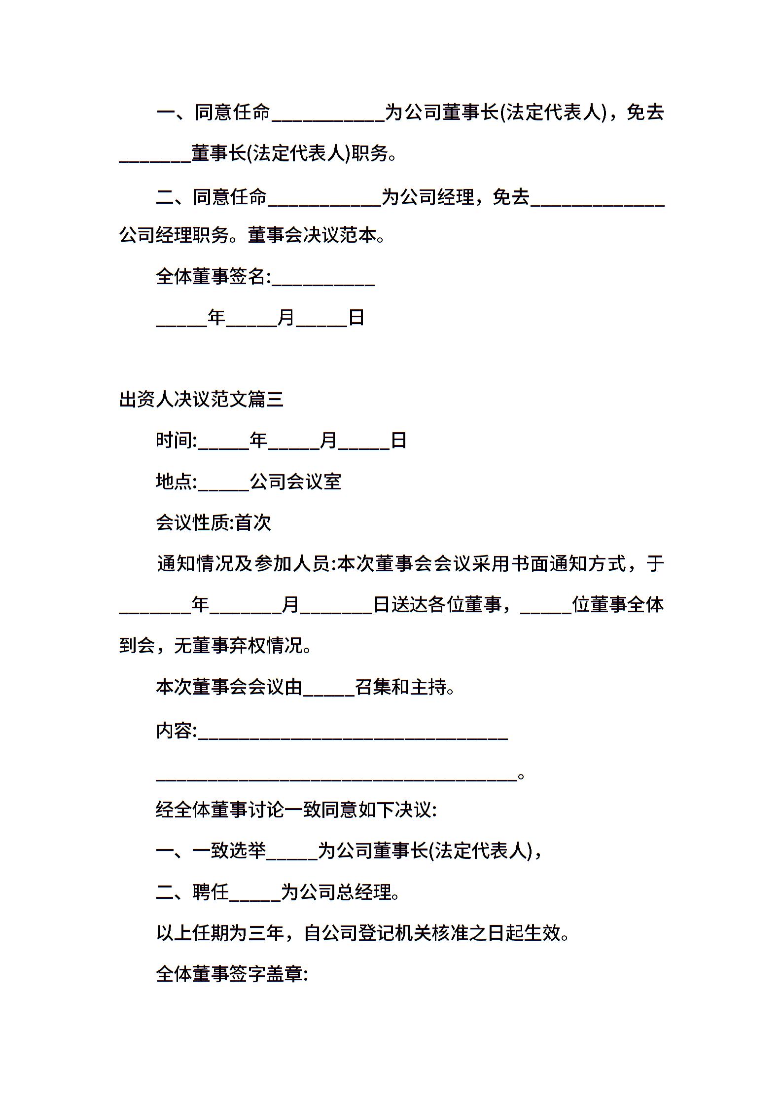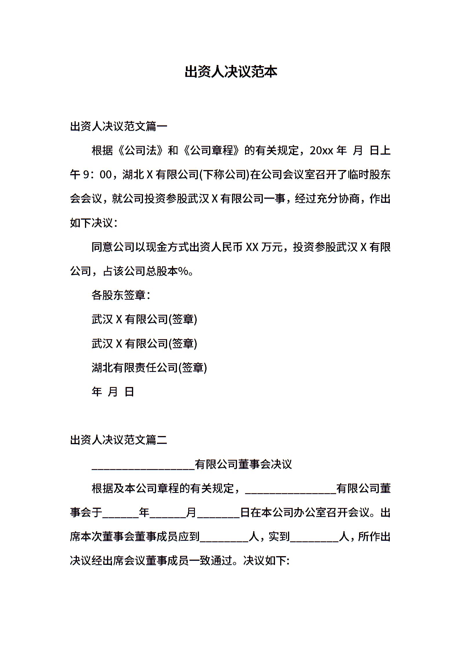 出资人决议范本