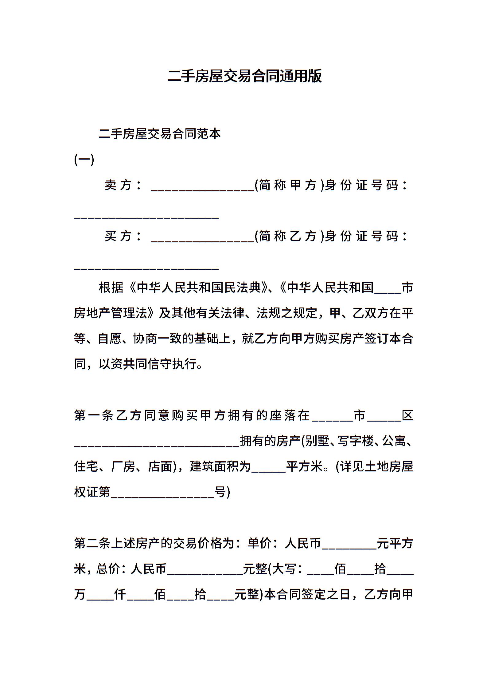 二手房屋交易合同通用版