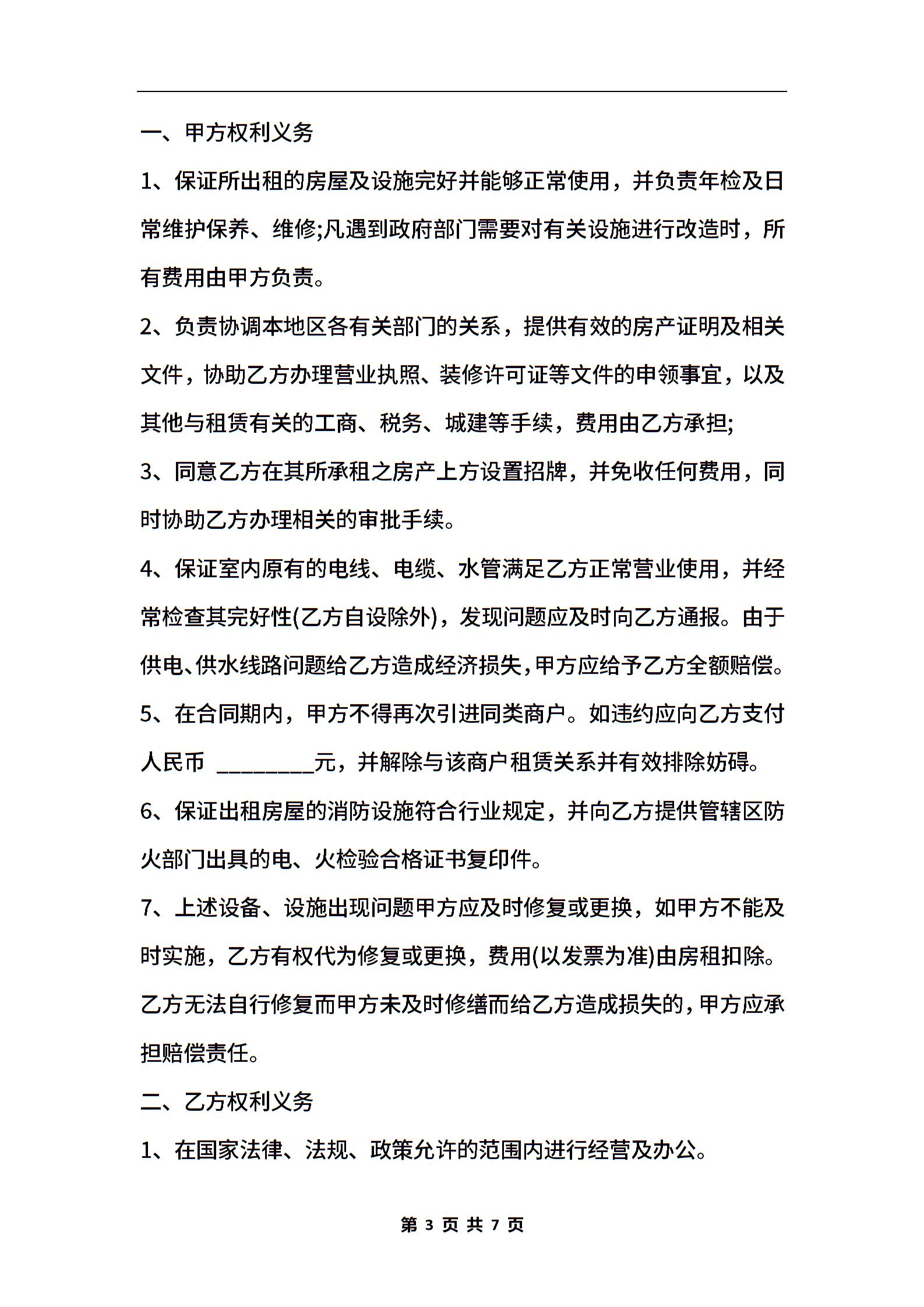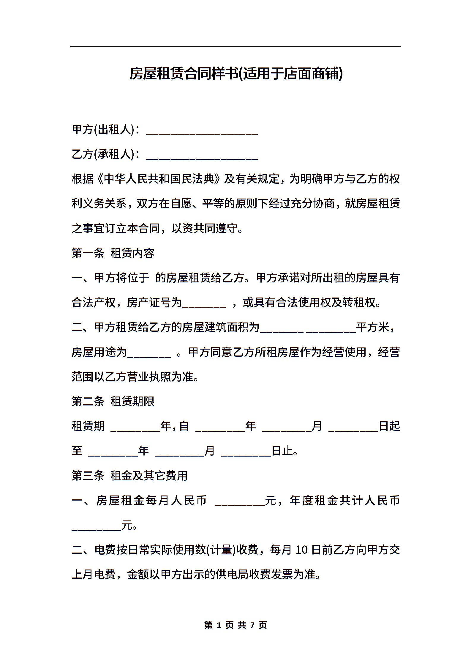 房屋租赁合同样书(适用于店面商铺)