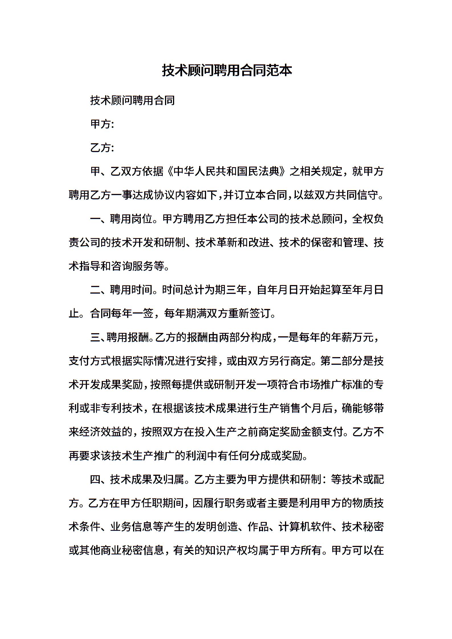 技术顾问聘用合同范本