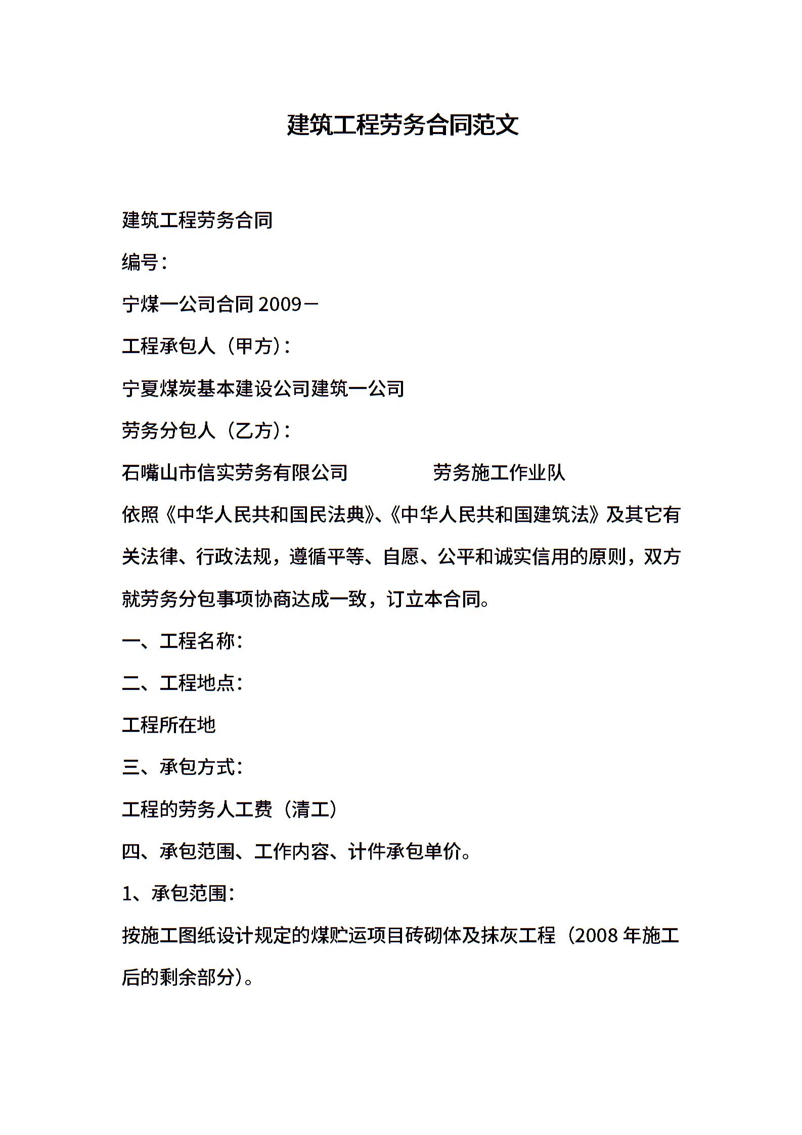 建筑工程劳务合同范文
