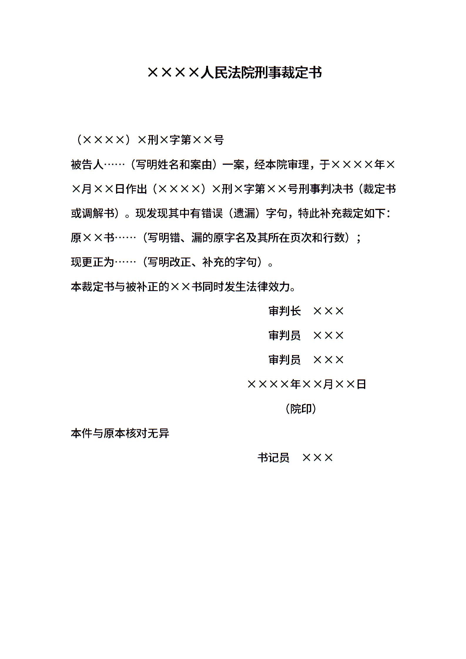 刑事裁定书(补正裁判文书失误用)