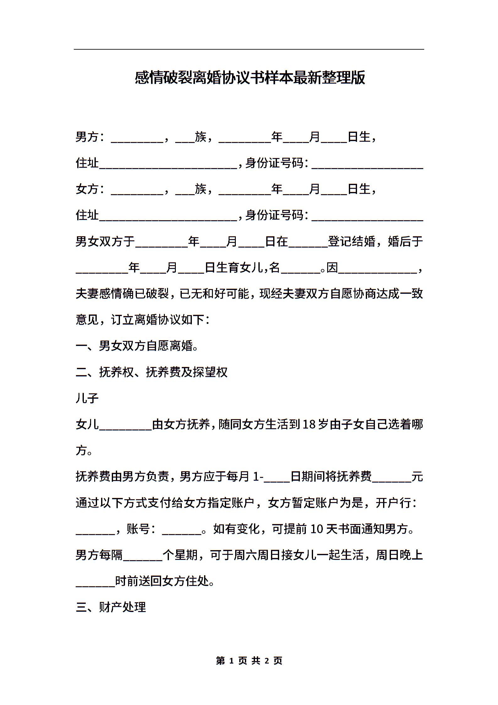 感情破裂离婚协议书样本最新整理版