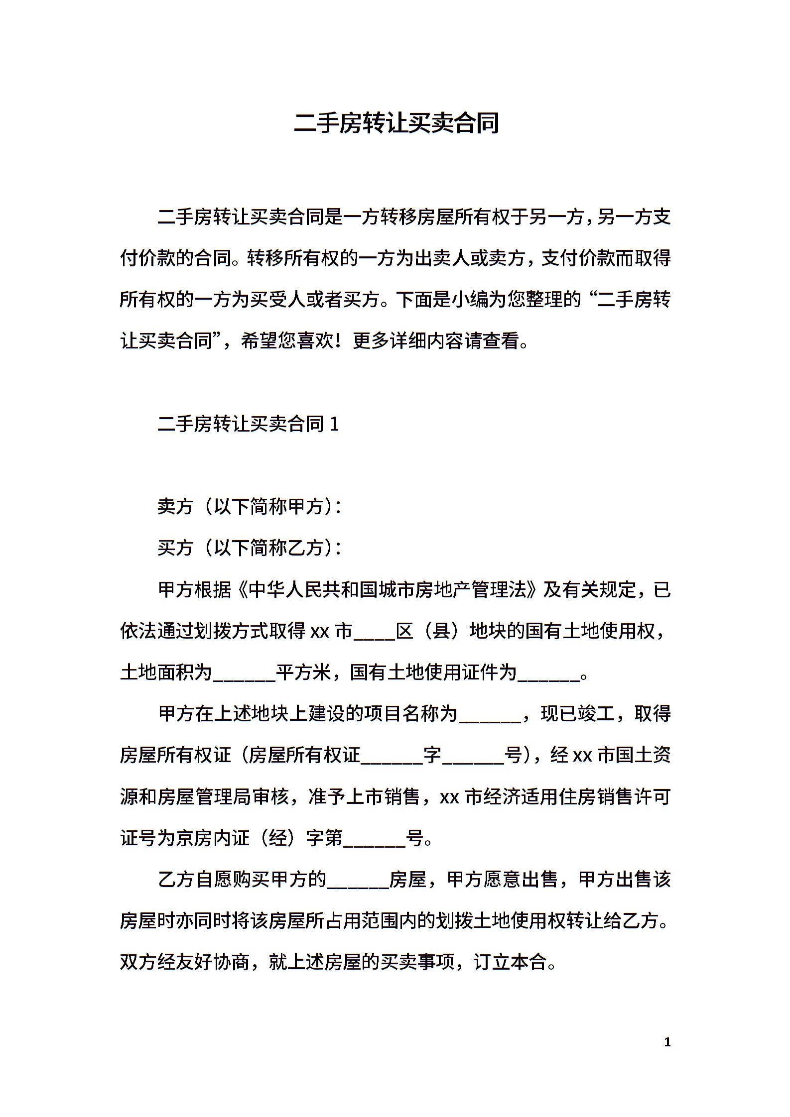 二手房转让买卖合同