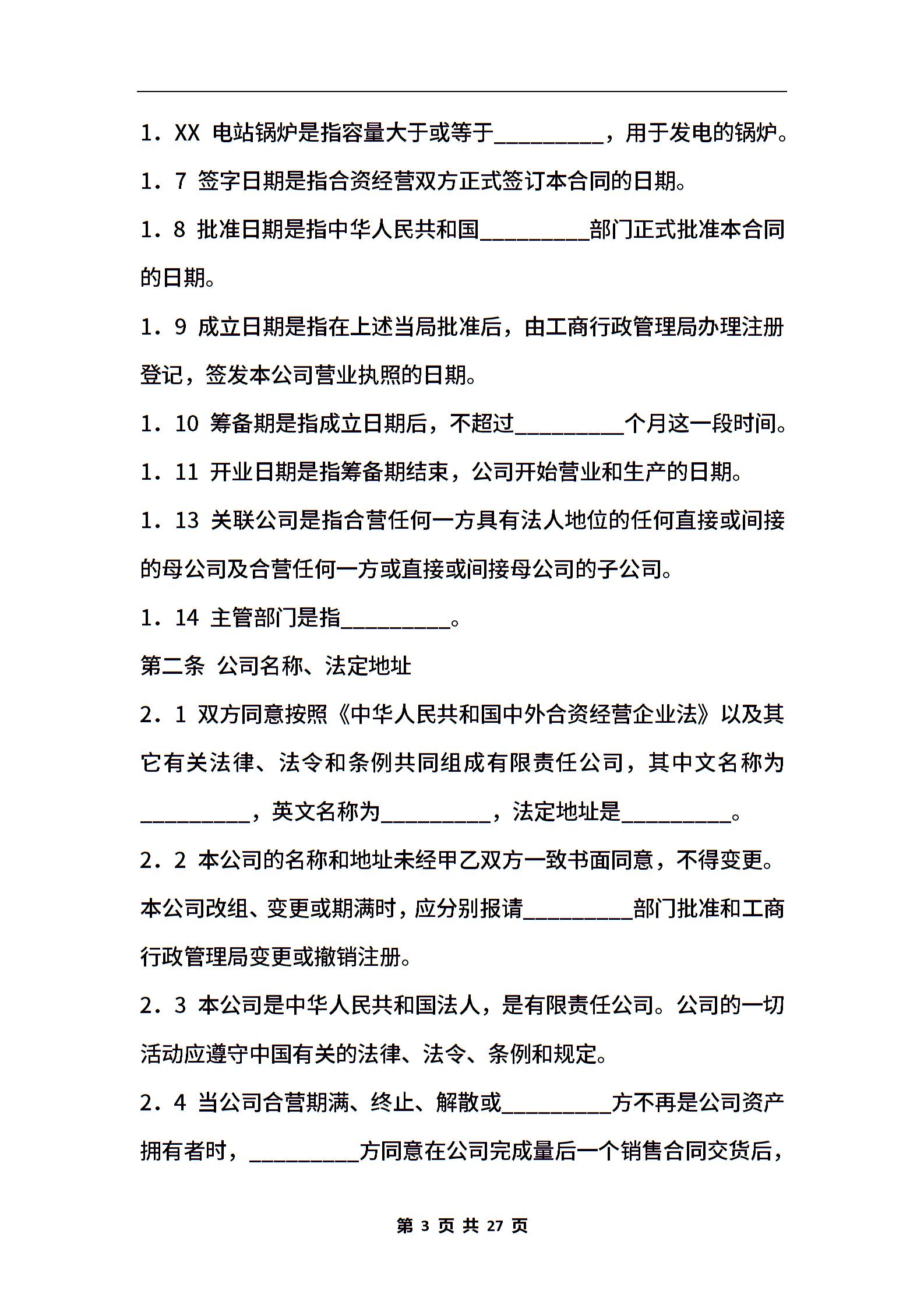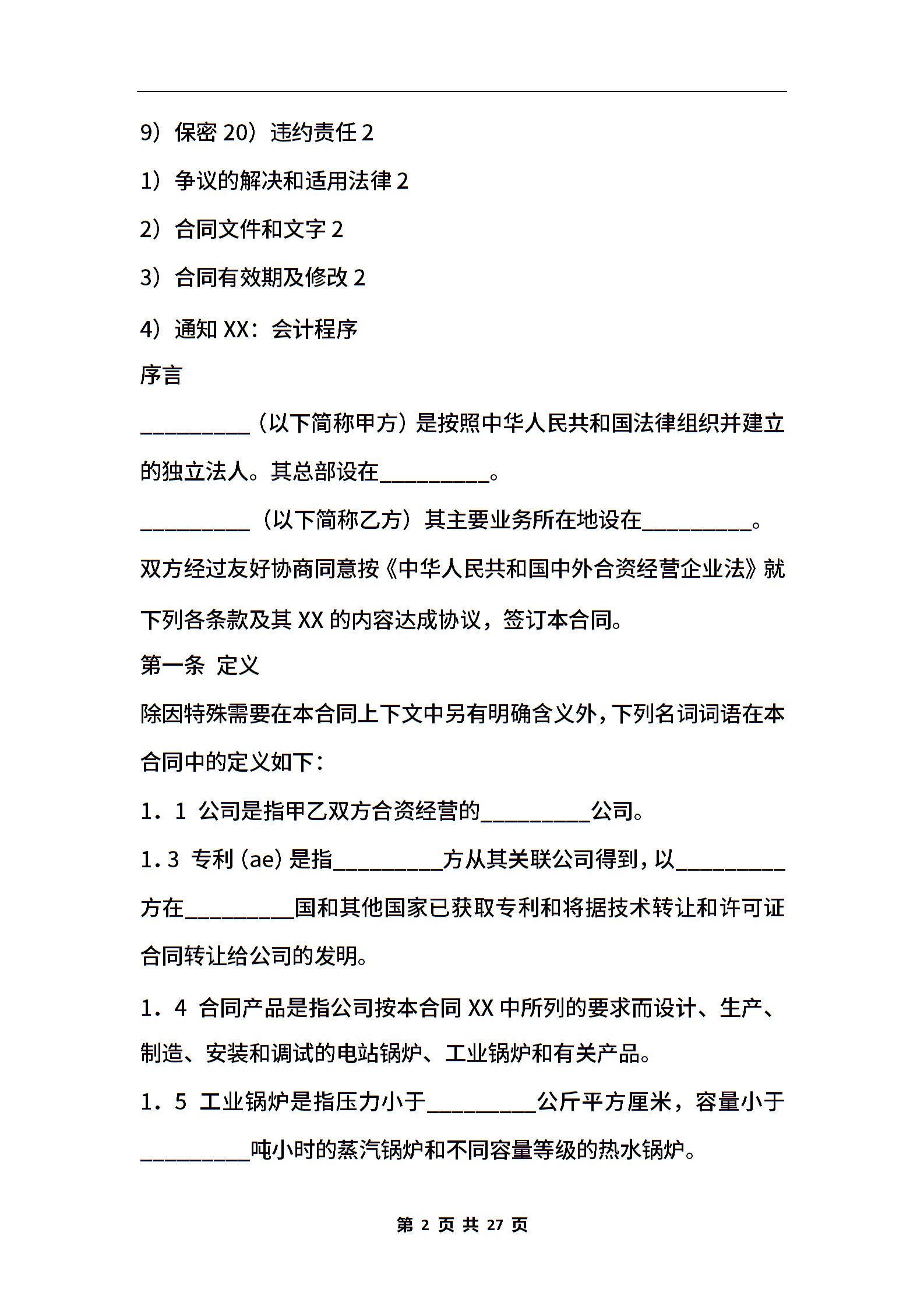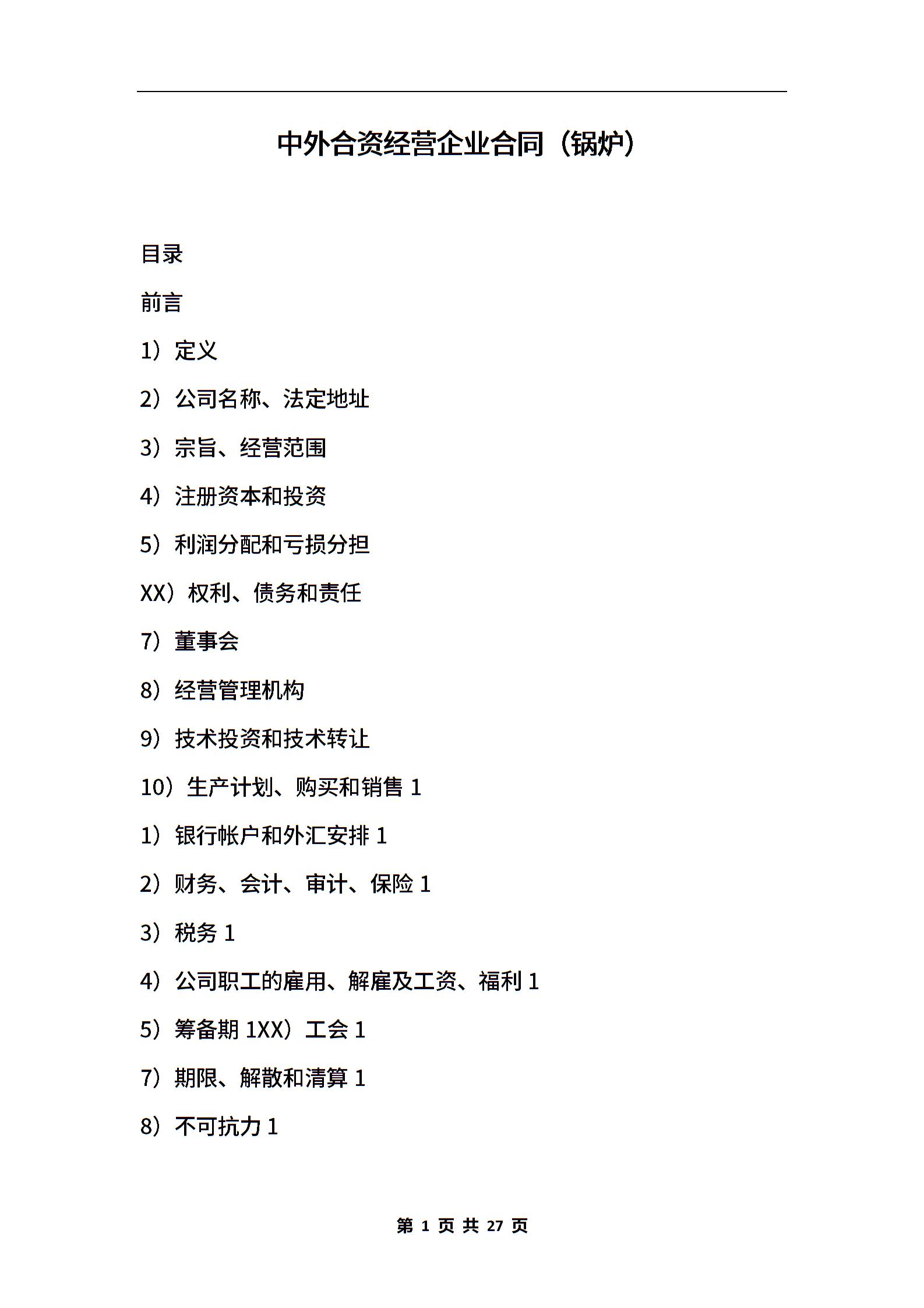 中外合资经营企业合同(锅炉)