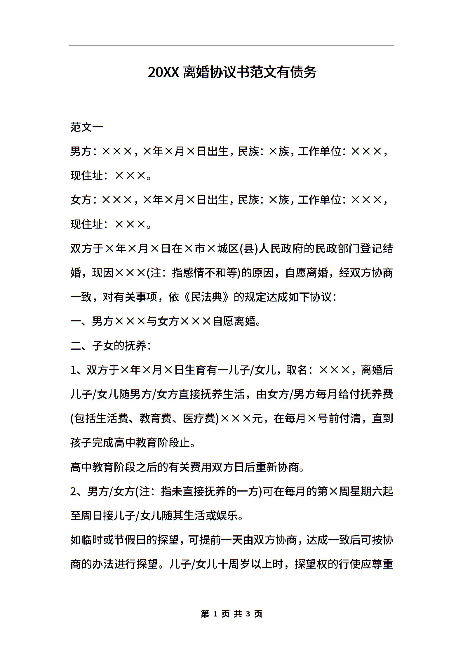 2020离婚协议书范文有债务