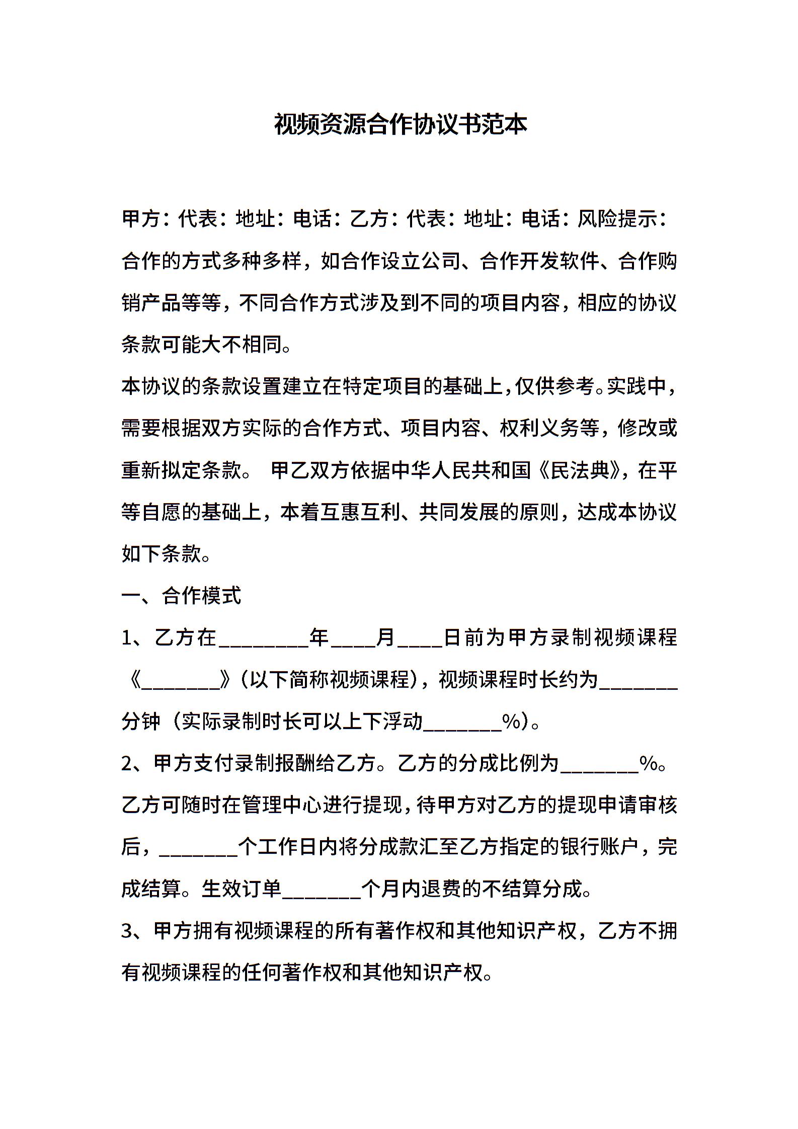 视频资源合作协议书范本