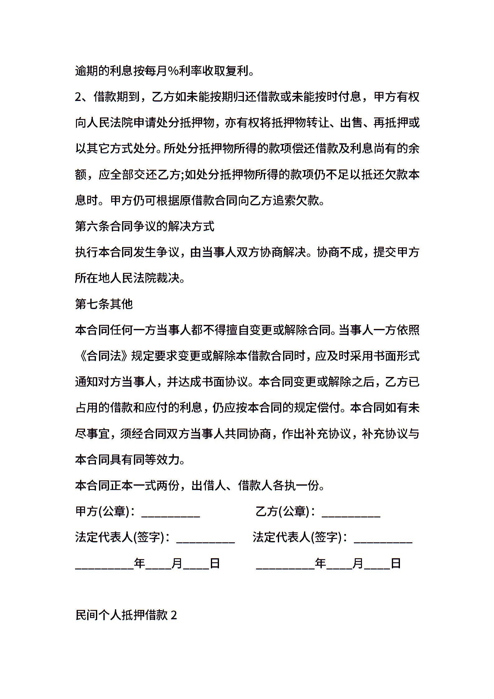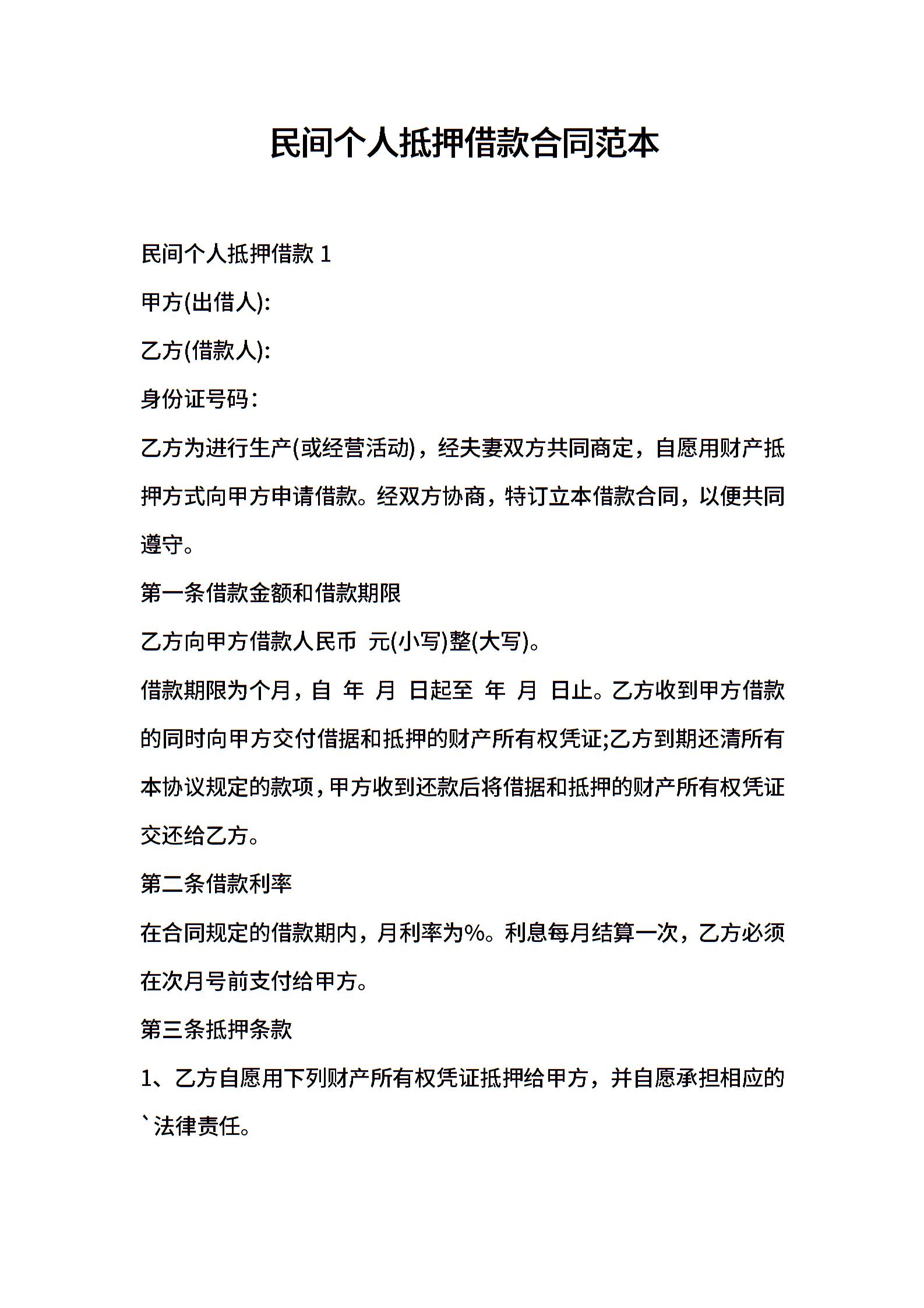 民间个人抵押借款合同范本