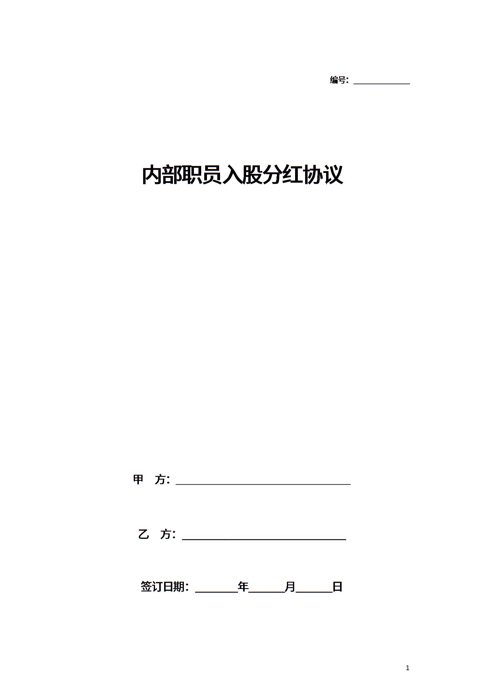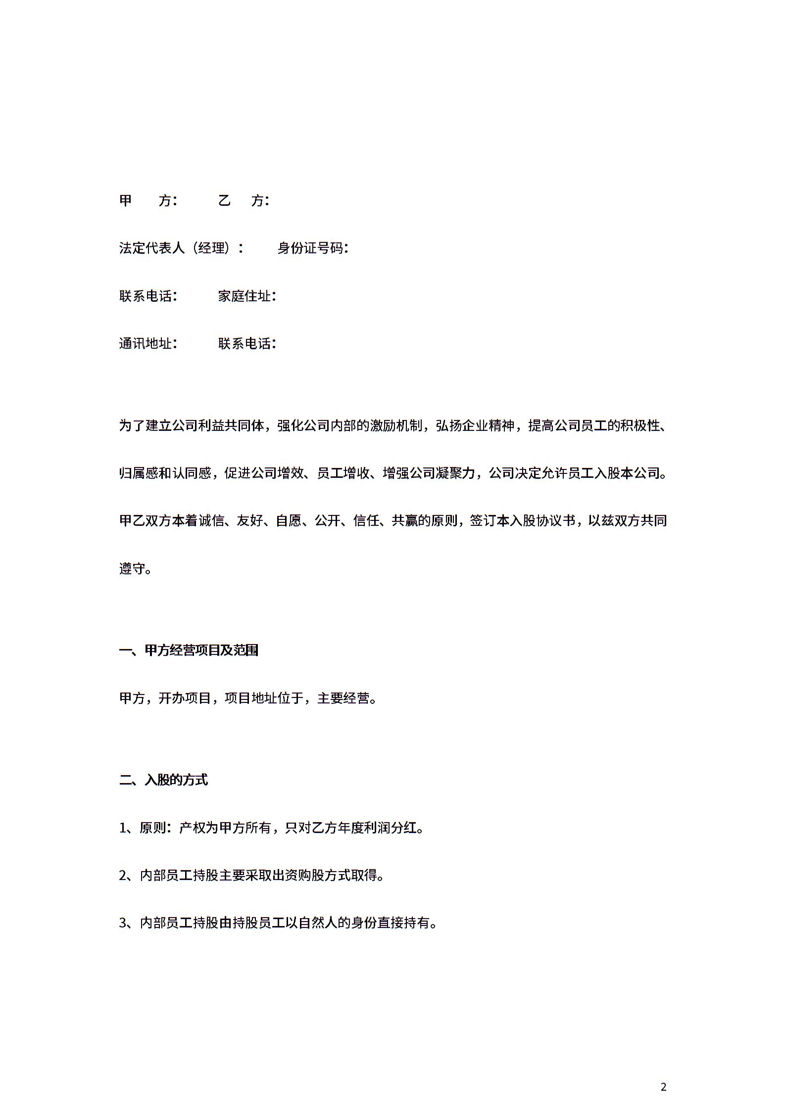 内部职员入股分红合同协议范本模板