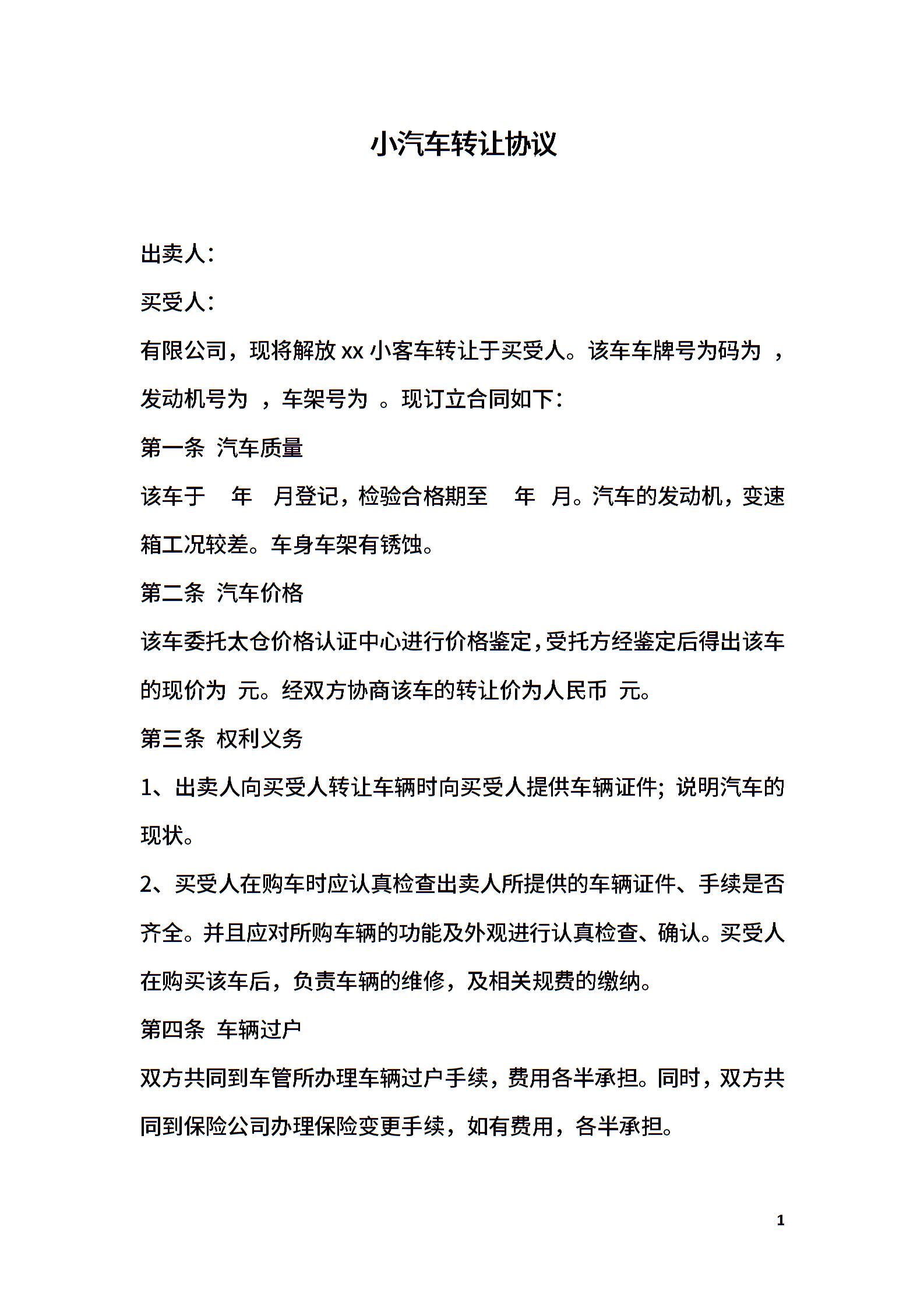 小汽车转让协议