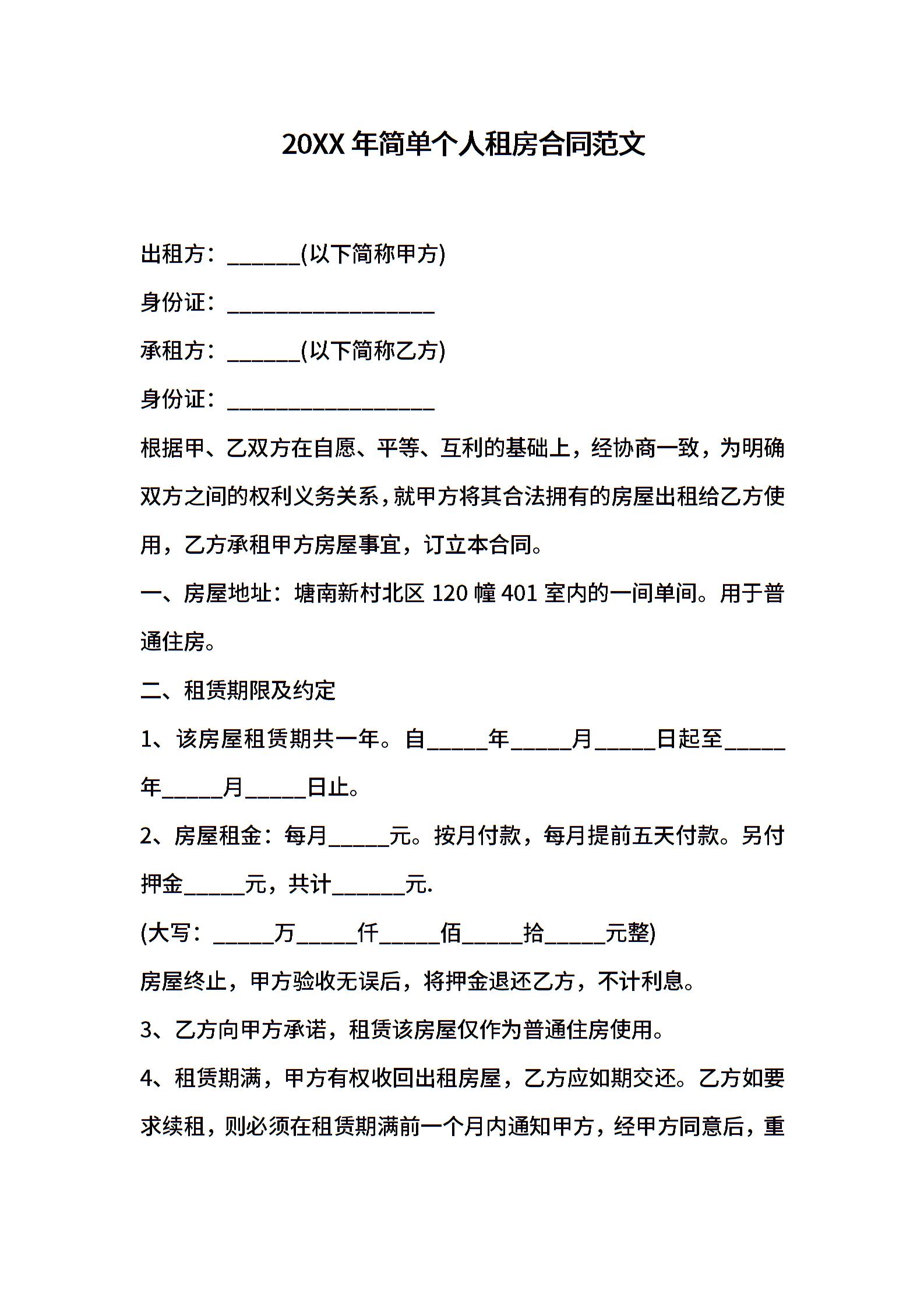 2021年简单个人租房合同范文