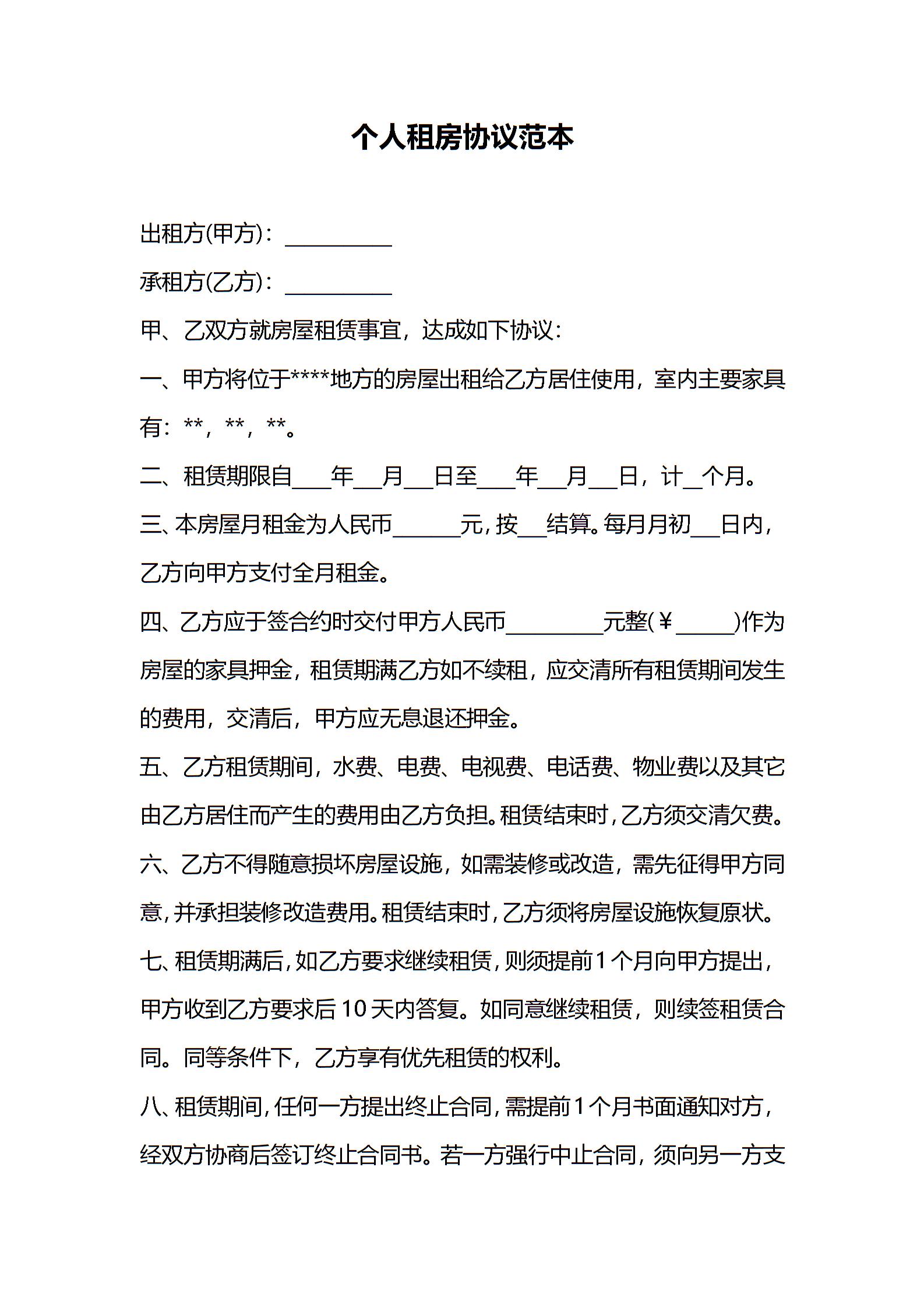 个人租房协议范本
