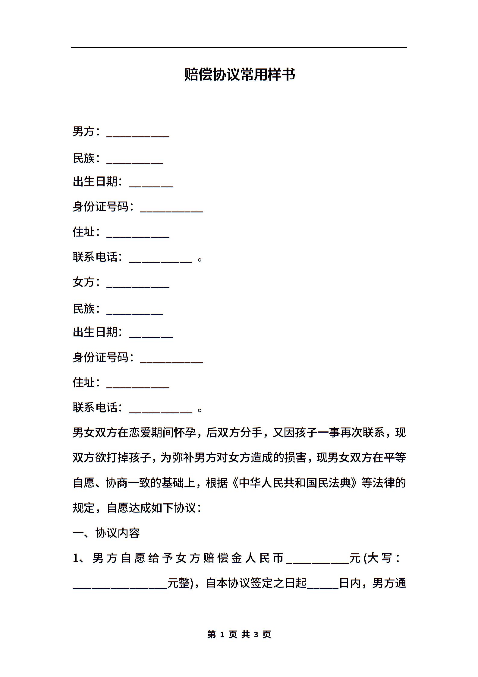 赔偿协议常用样书