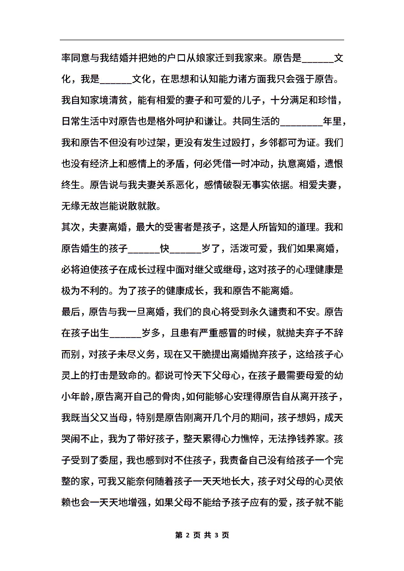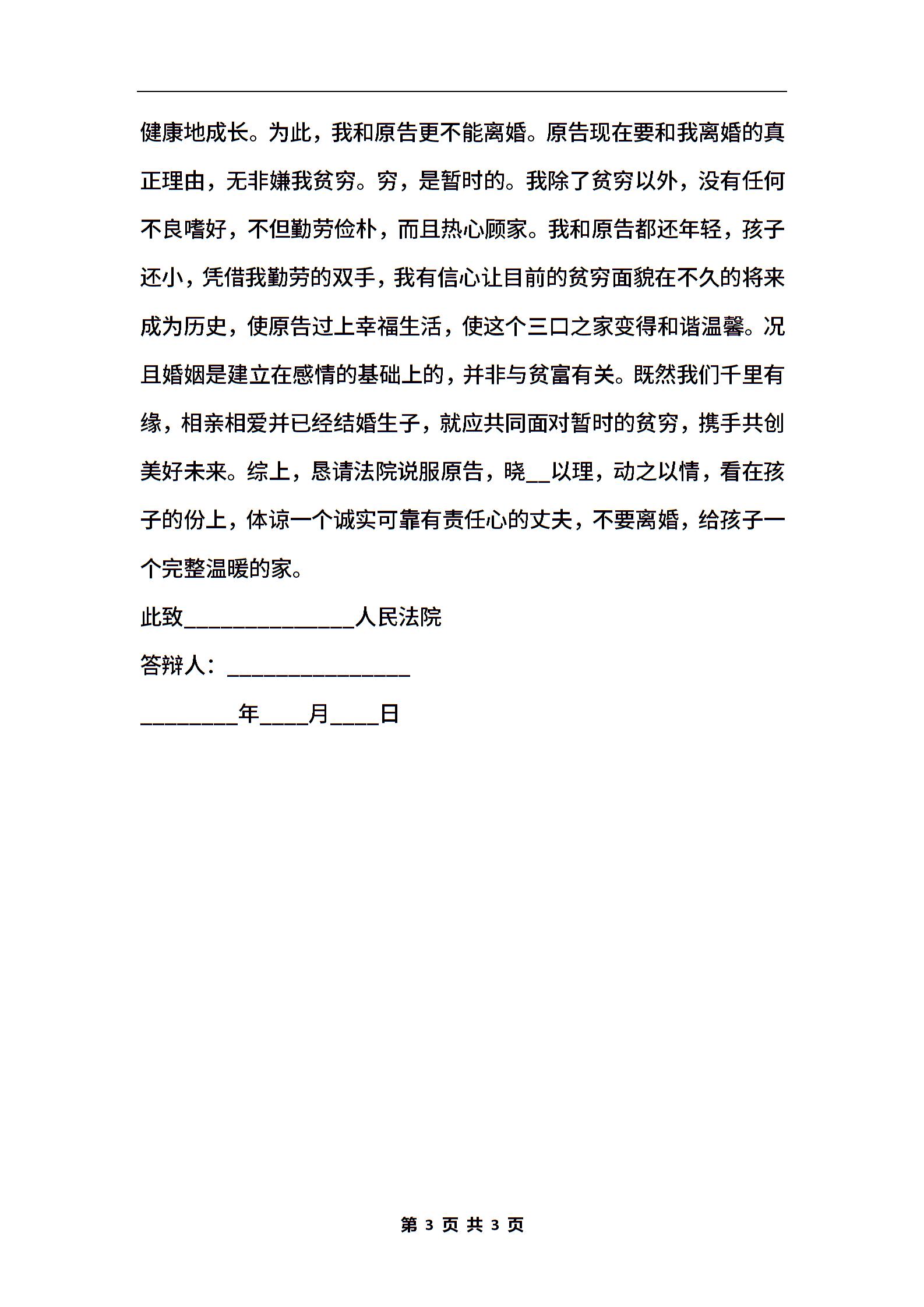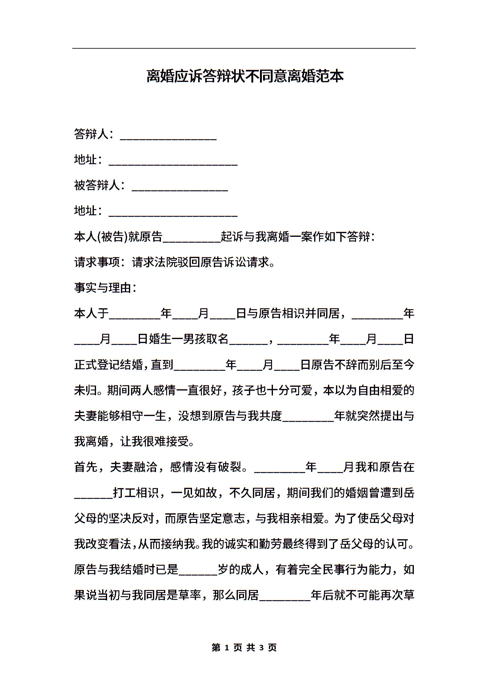 离婚应诉答辩状不同意离婚范本