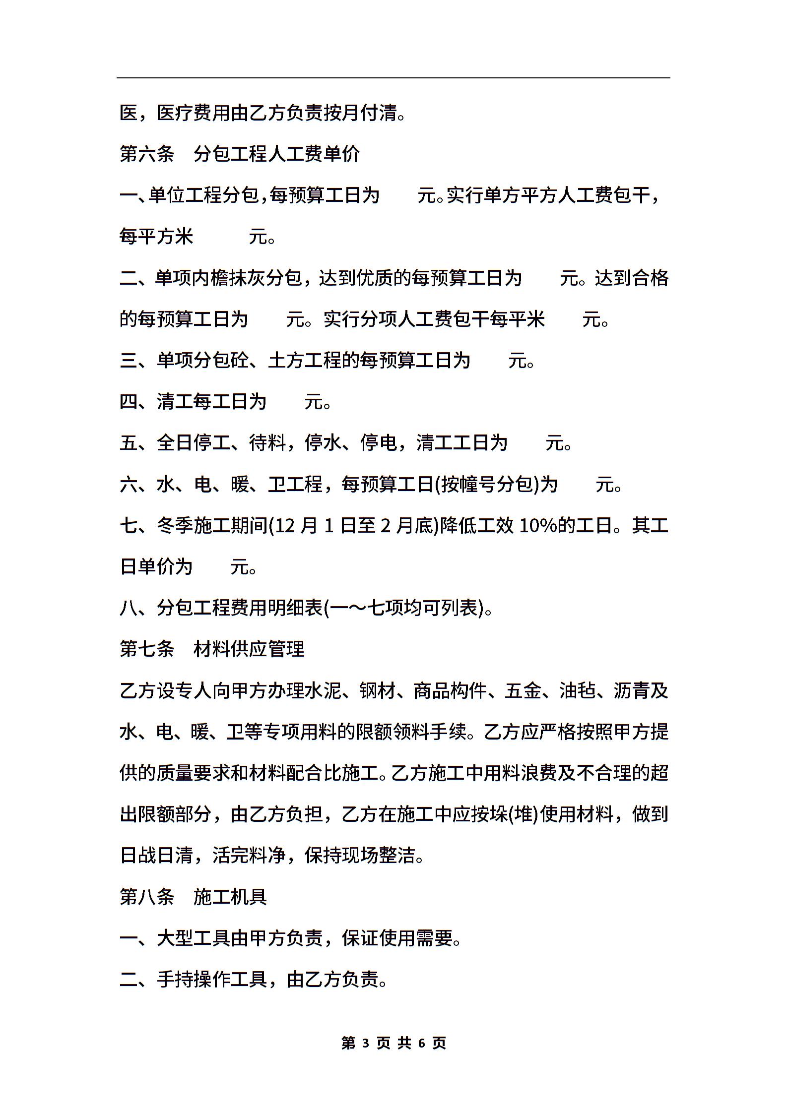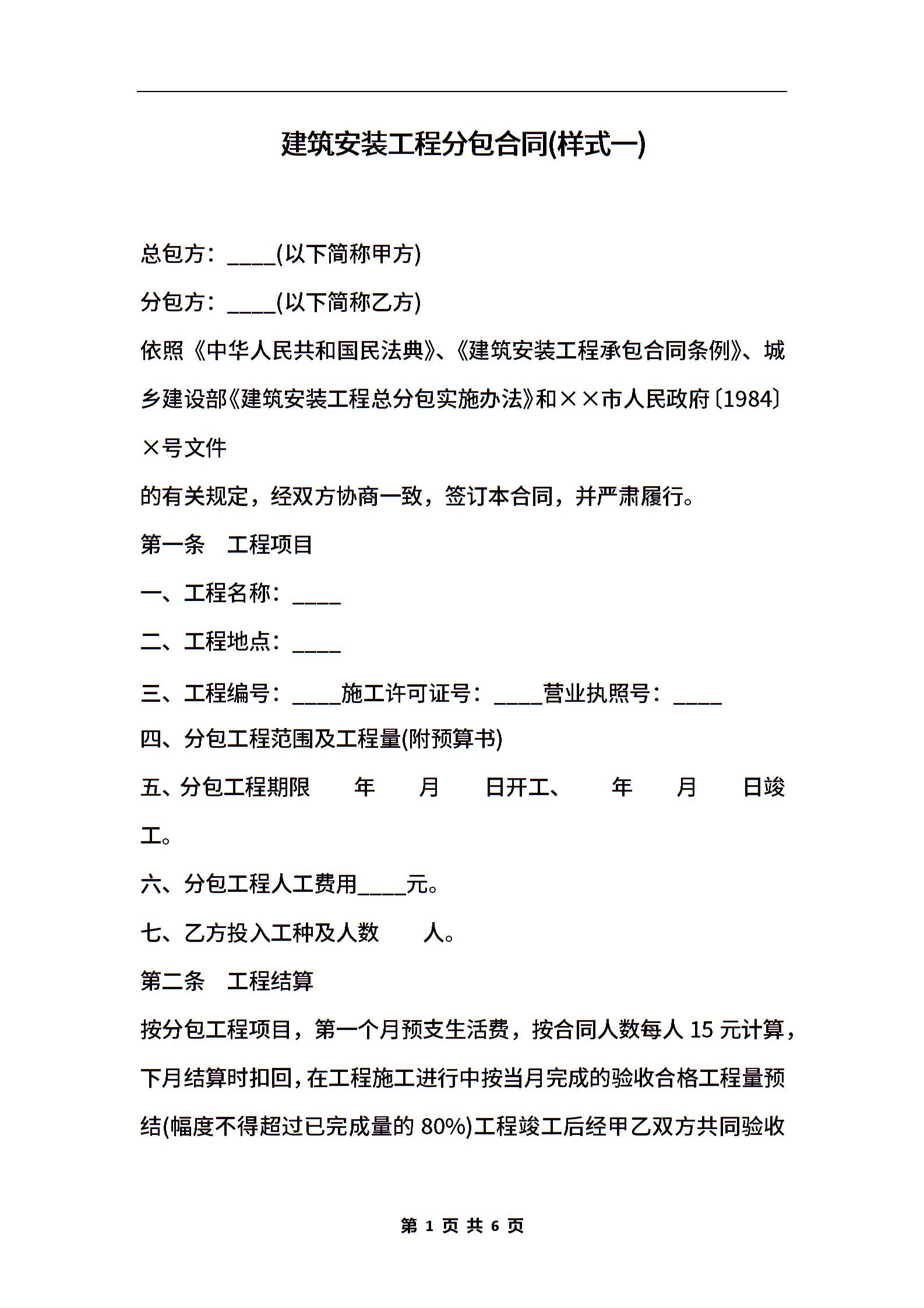 建筑安装工程分包合同(样式一)